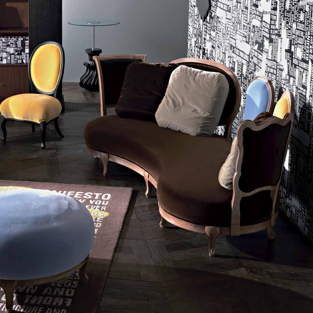 En unik stil och udda funktioner soffan Manno. 5 olika ryggar för former och färger bidra till att ge dynamik och personlighet till soffan. Strukturen är tillverkad av handsnidade massiv valnöt trä. Den rygg och sits är klädda med tyg lock.