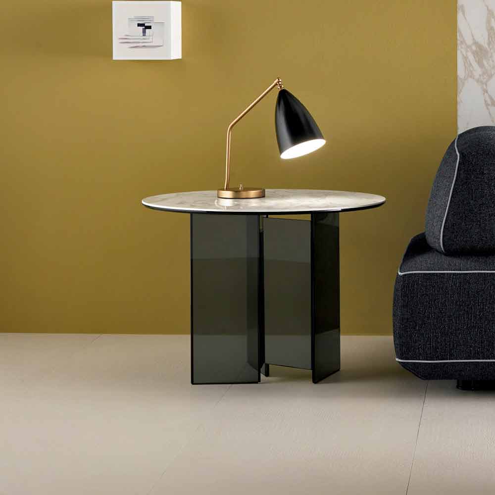 Tillverkad av rökt glas för basen och en polerad arabisk kalacatta keramikskiva , det är en möbel som är handgjord i Italien med högkvalitativa material som är idealiska för vardagsrummet.