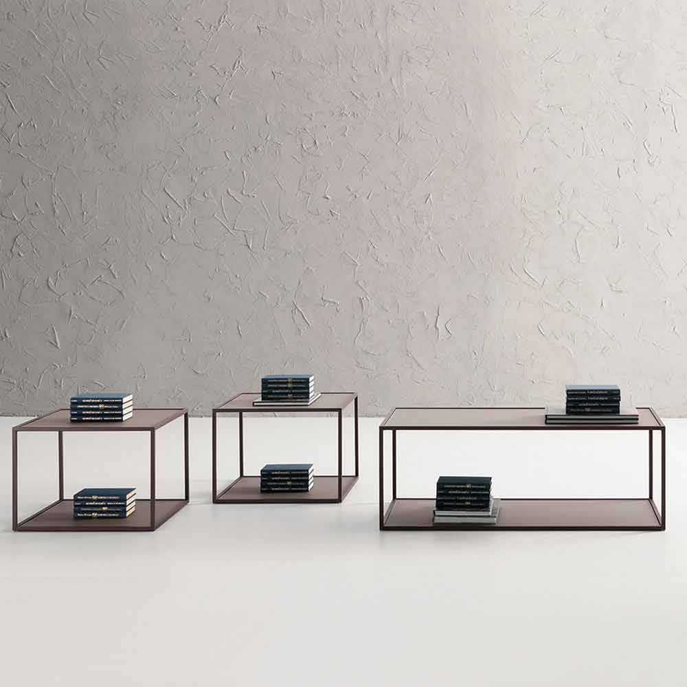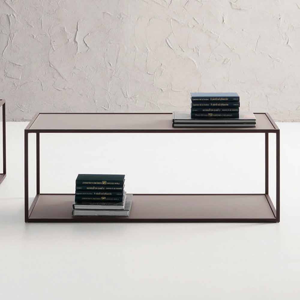 Soffbord tillverkat i Italien med målad metallstruktur i grafitfinish och dubbel topp i satinglas med fingeravtryck med lerafinish. En produkt vars idé bygger på enkelhet och väsentlighet för att ge liv till en möbel med en modern och mångsidig stil som kan anpassas till alla vardagsrum, vilket ger en innovativ och elegant touch. Den speciella utformningen av strukturen gör det möjligt att erhålla en dubbel stödyta och därmed erbjuda möjligheten att organisera olika användbara föremål som böcker, tidskrifter eller fjärrkontroller men också enkla dekorativa element som berikar designen och ökar dess värde genom att betona den. den exklusiva estetiken .