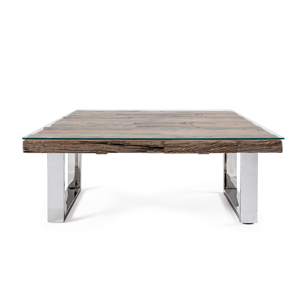 Detta soffbord är gjort med en skiva av återvunnet trä i naturlig finish och härdat glas med ben i rostfritt stål att montera.