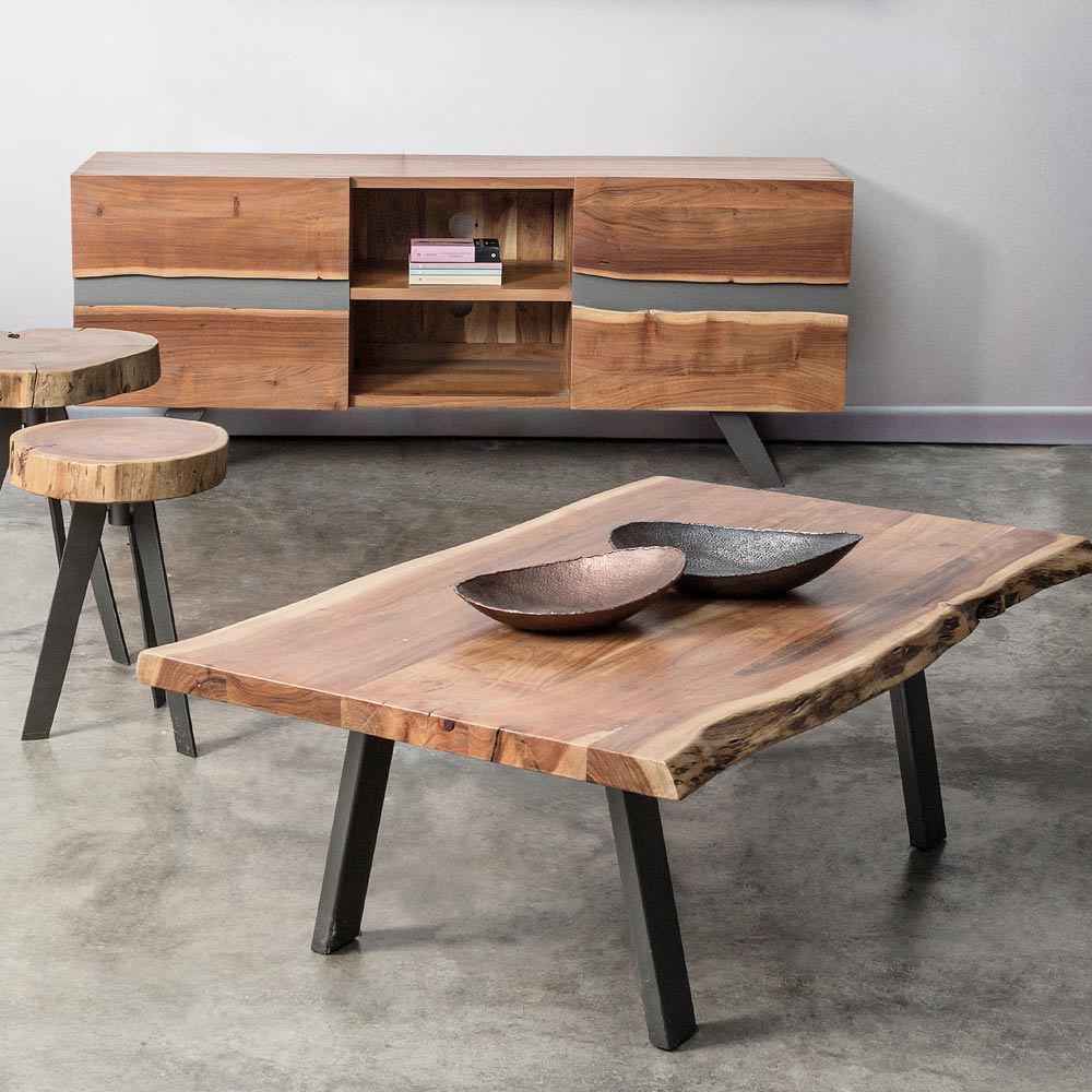 Dess verkliga huvuddrag ges av akaciaträskivan med oregelbundna kanter (levande träeffekt) handgjord med en polyuretanlack-baserad finish.
