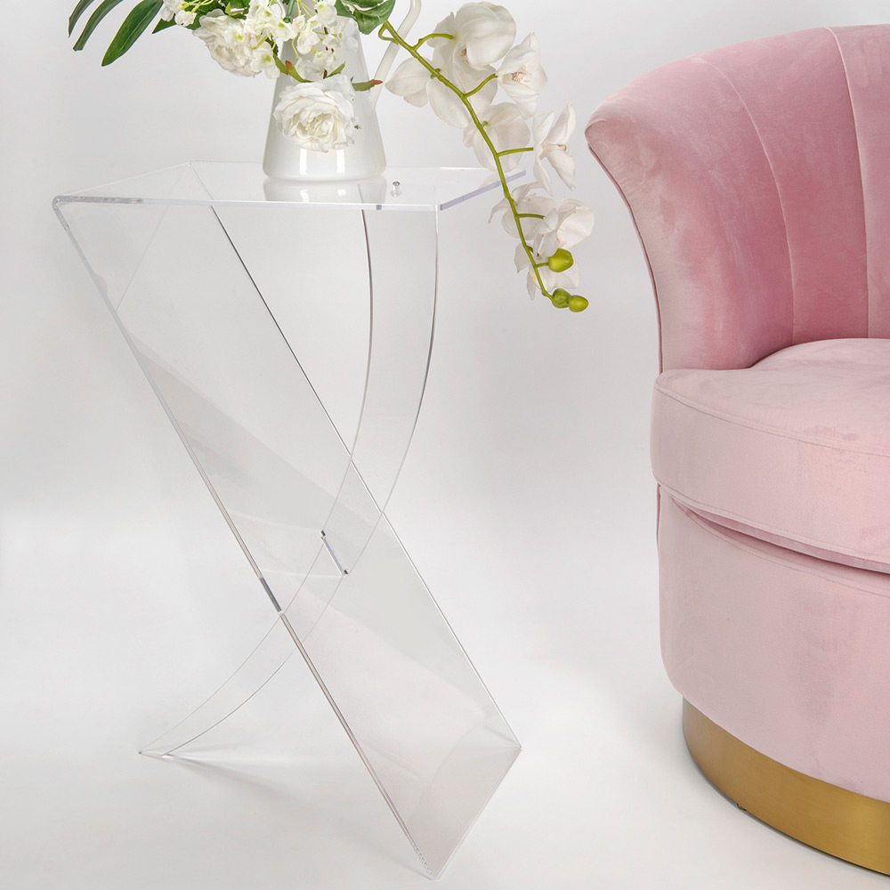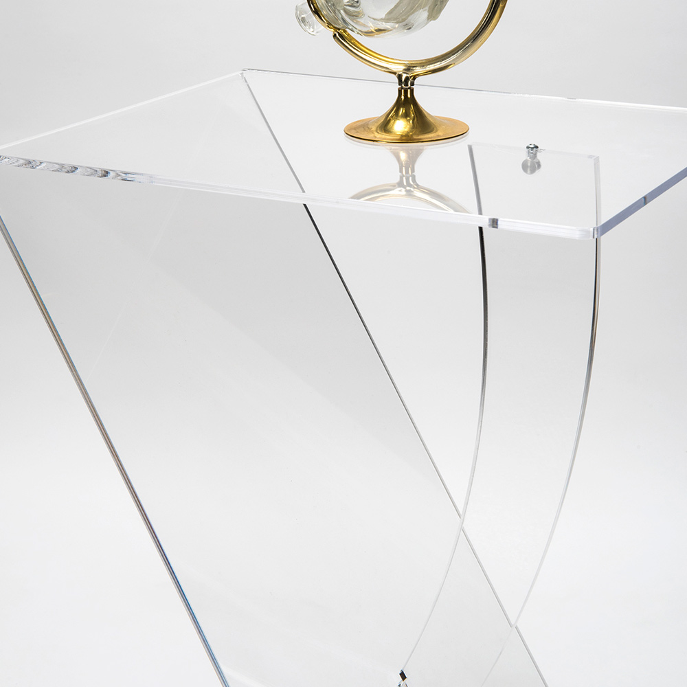 Detta soffbord är helt tillverkat av transparent plexiglas, ett val som förbättrar dess mångsidighet och motståndskraft. Med sin dubbla hylla ger den extra utrymme för dina böcker, glasögon eller något annat föremål du vill ha nära till hands, och behåller alltid ett snyggt och elegant utseende.