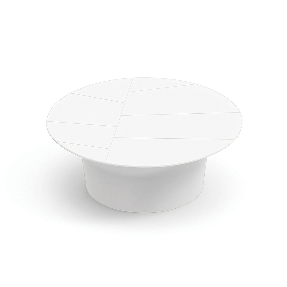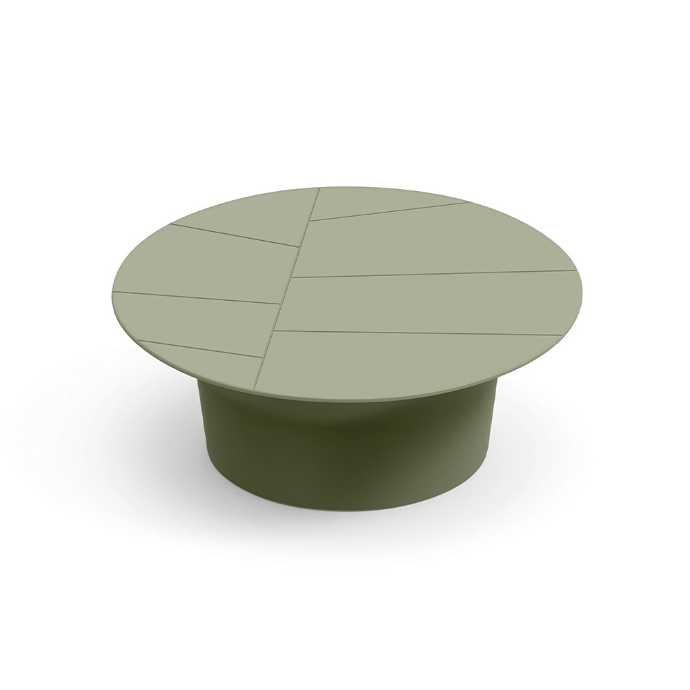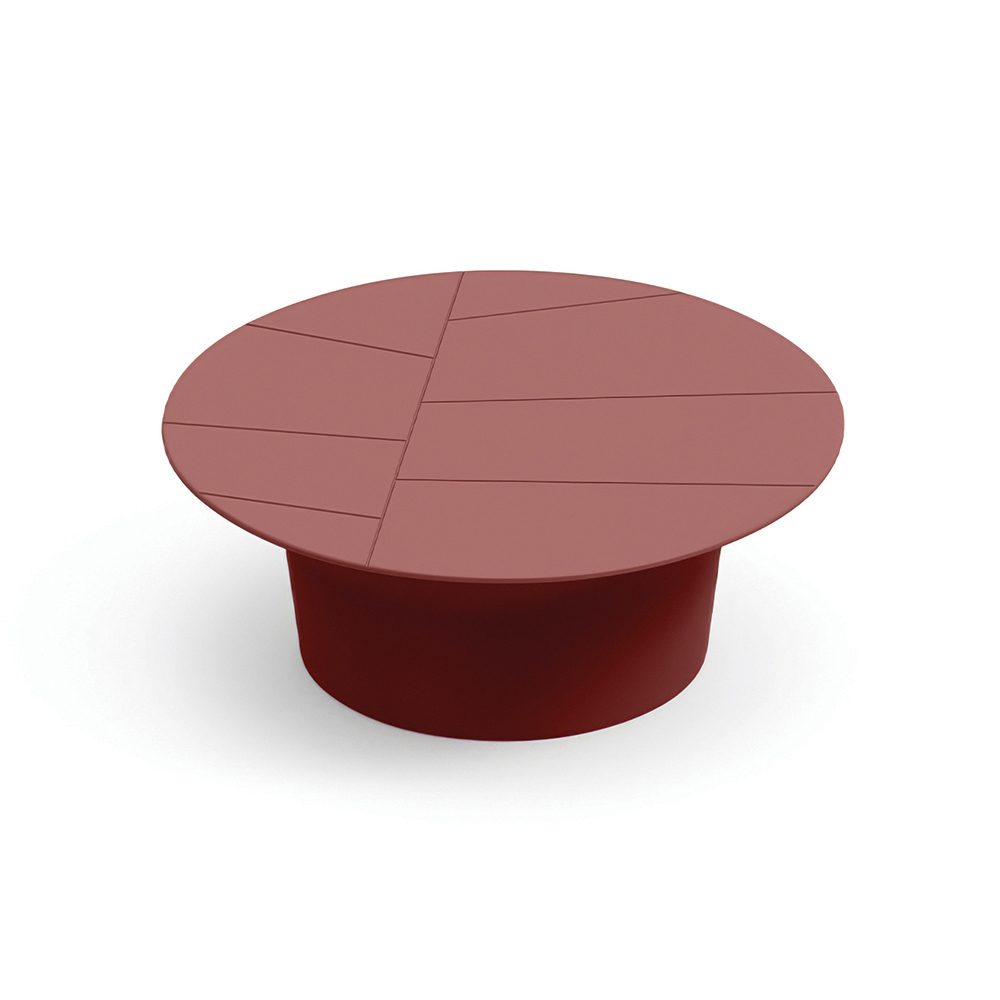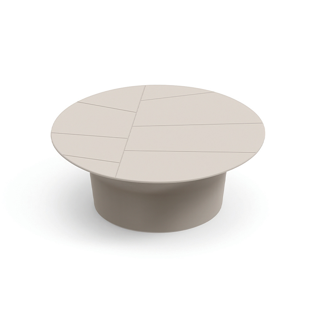 Detta soffbord kännetecknas av sin enkla runda form och balanserade proportioner, vilket gör det till det perfekta komplementet till moderna utomhusutrymmen. Bordskivan, dekorerad med linjära geometriska snitt , skapar en raffinerad grafisk effekt som framhäver ytan.