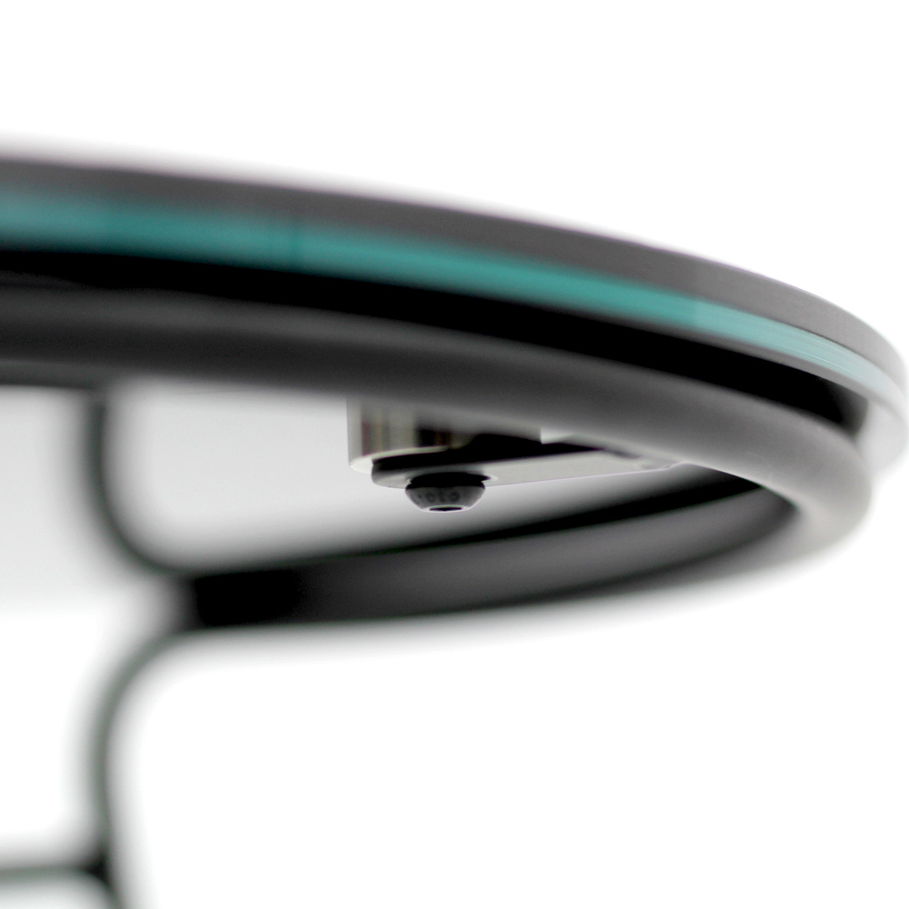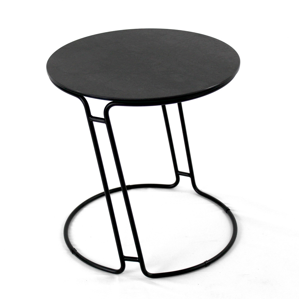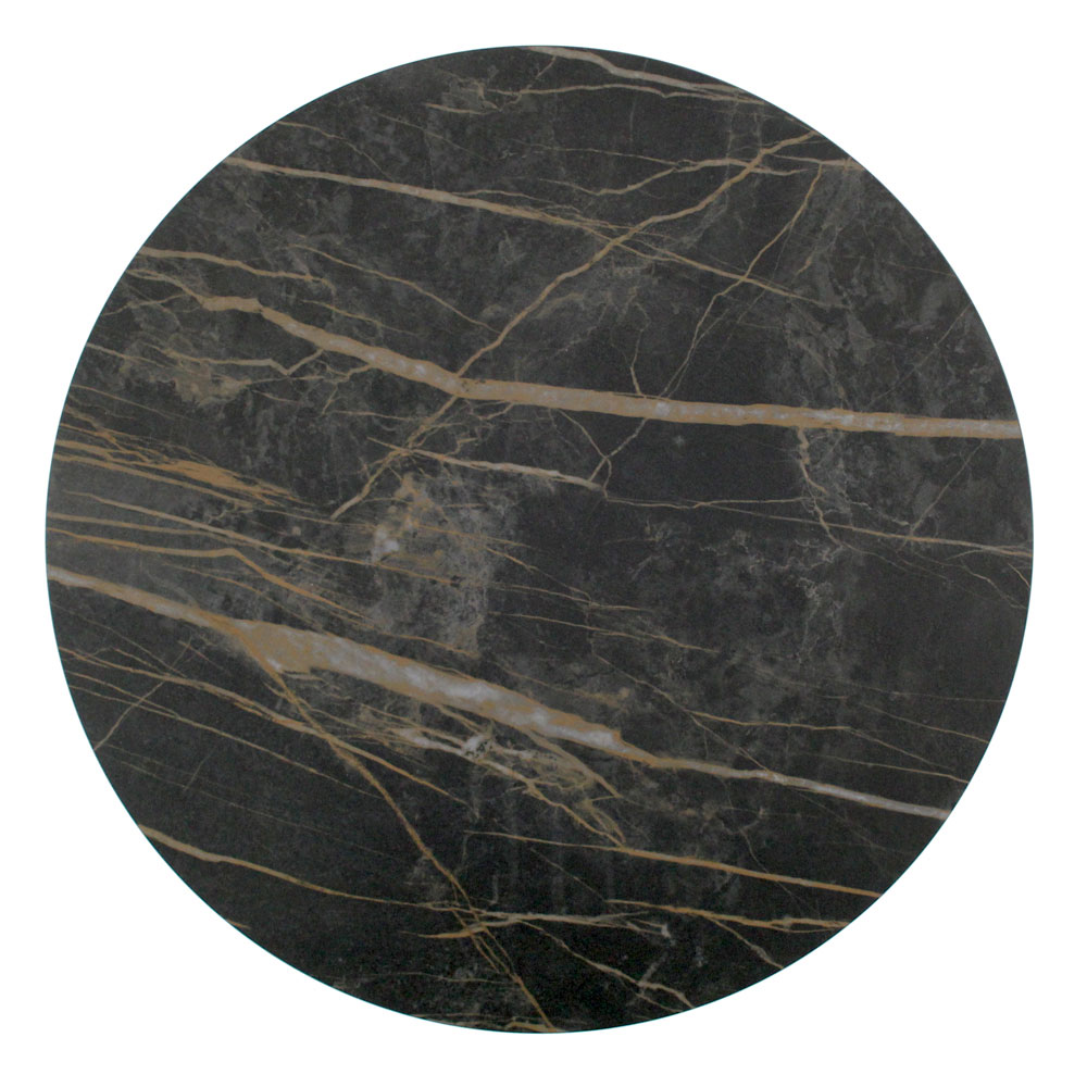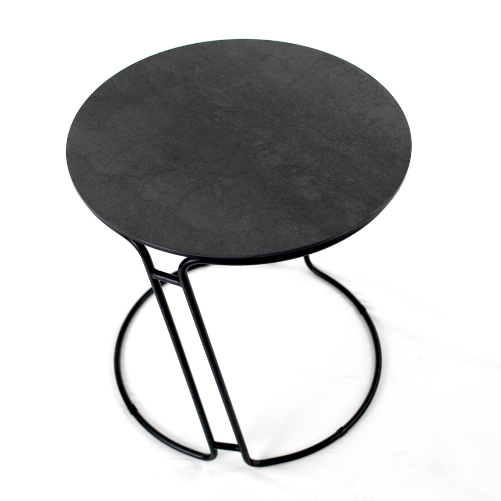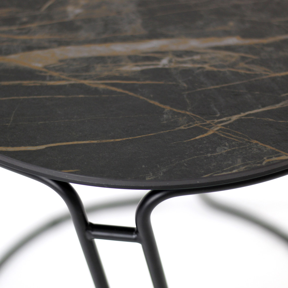 Runt soffbord med lackerad stålfot och topp i porslin i stengods.