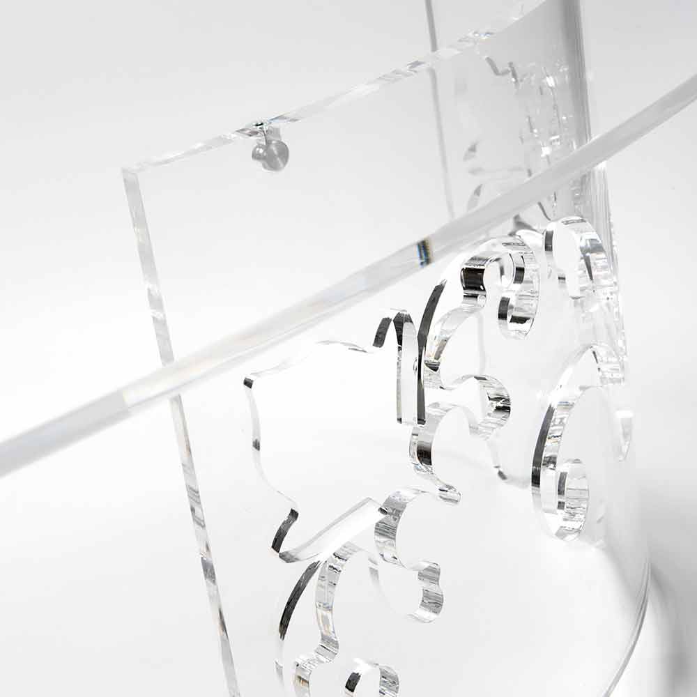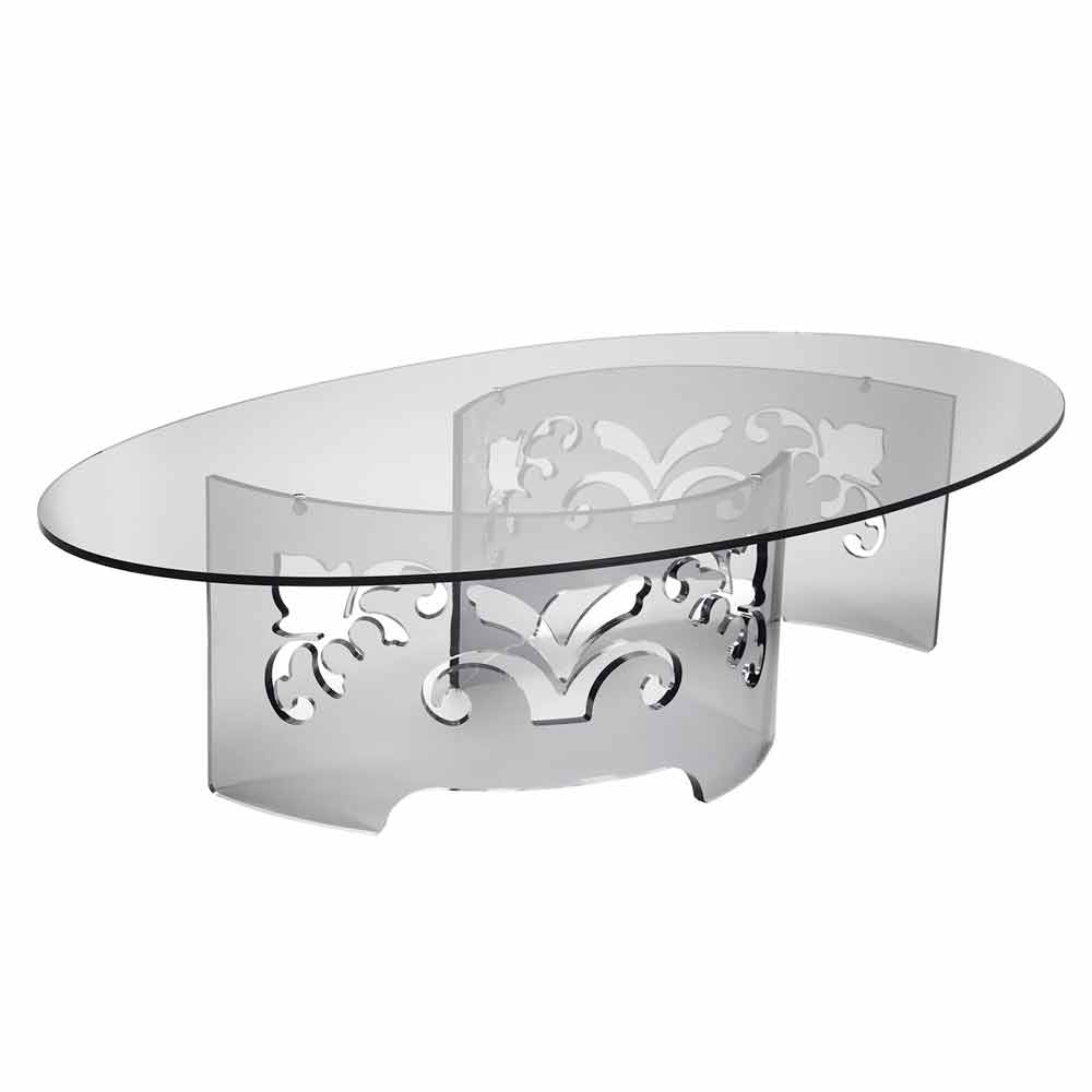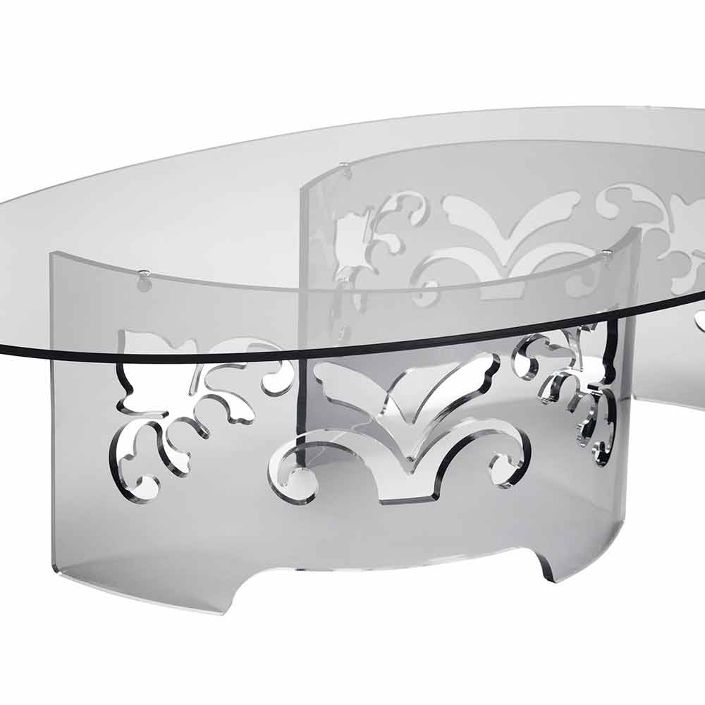 Ovalt soffbord i transparent eller rökt plexiglas med laserskuren dekorerad bas tillverkad i Italien.