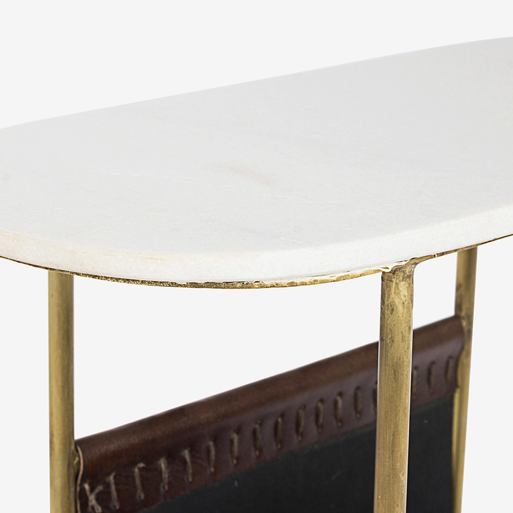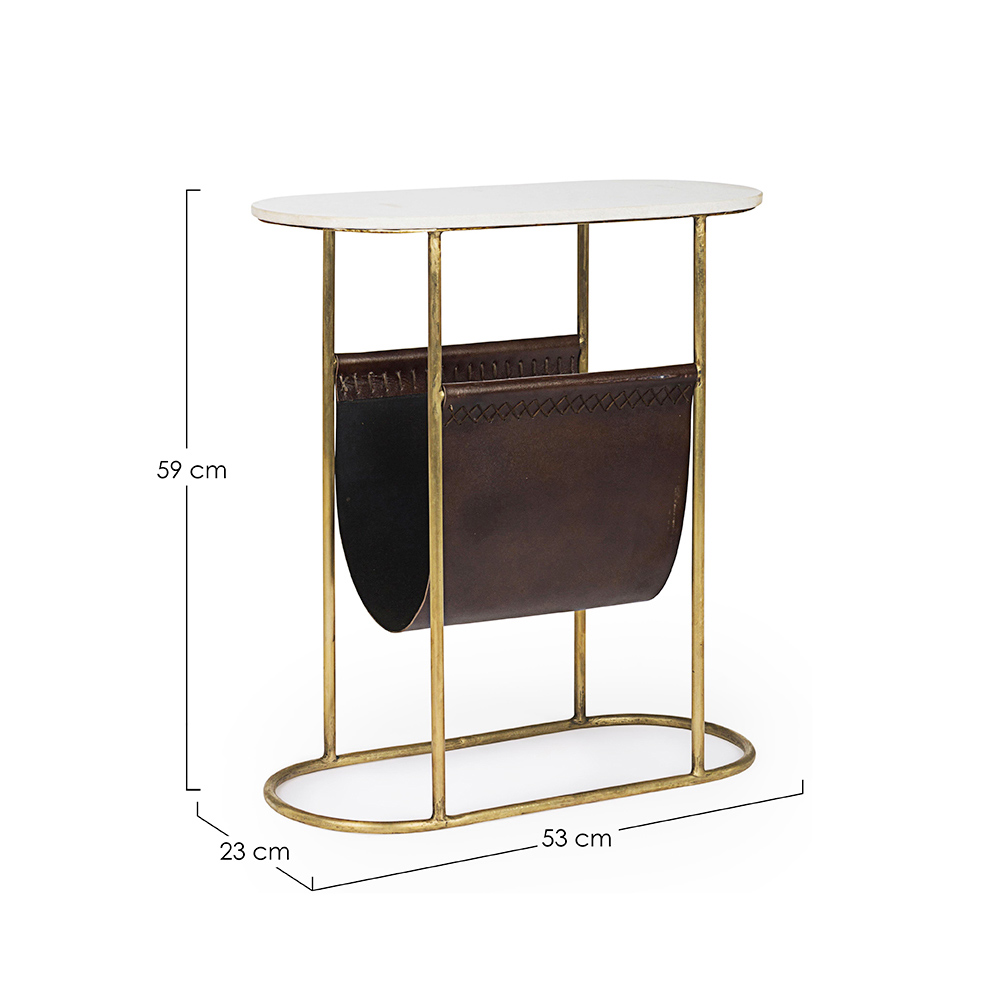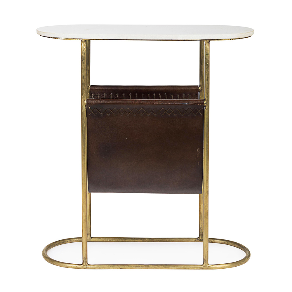 Soffbord i mässingspläterat stål och marmorskiva med tidningsställ i läder.
