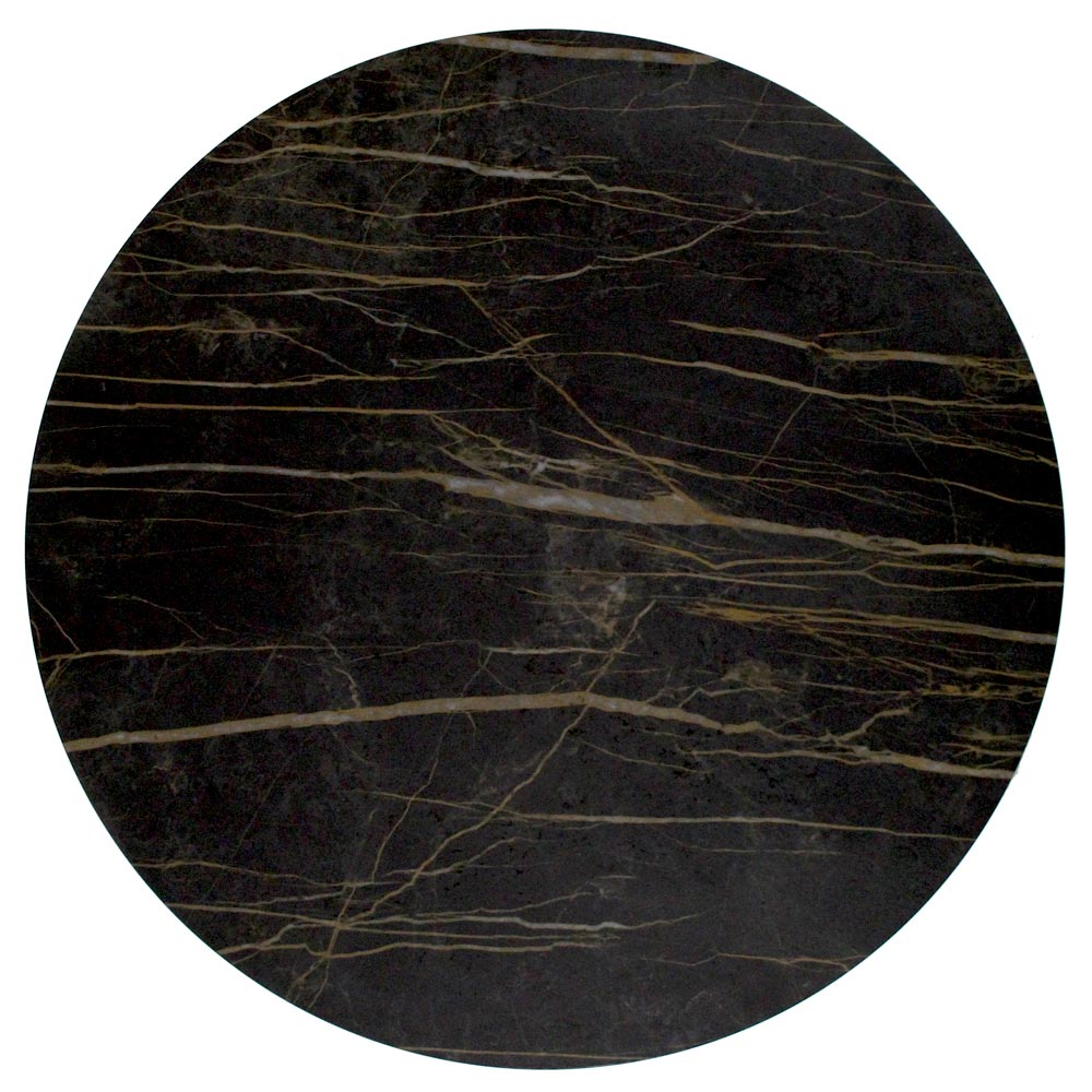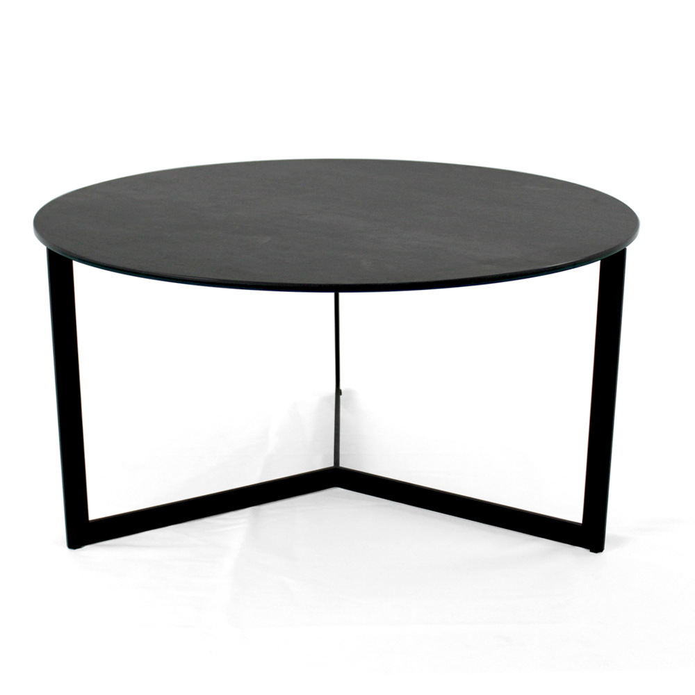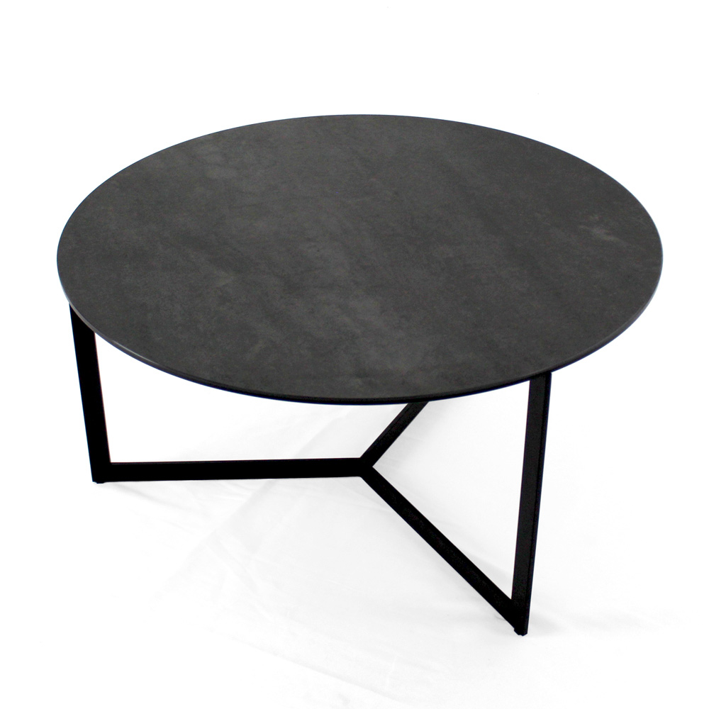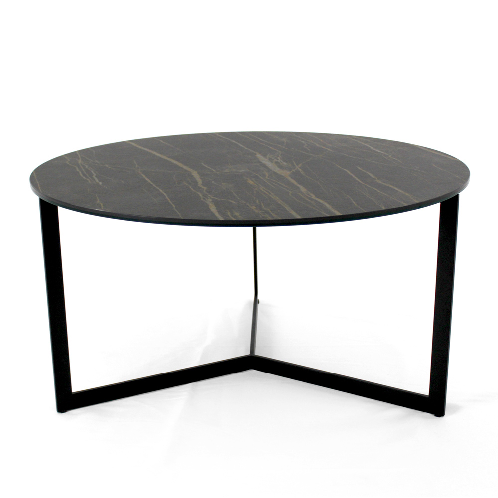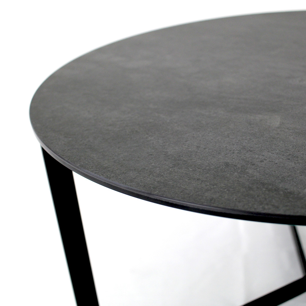 Runt soffbord med underrede i målat stål och skiva i grès porslinsstengods
