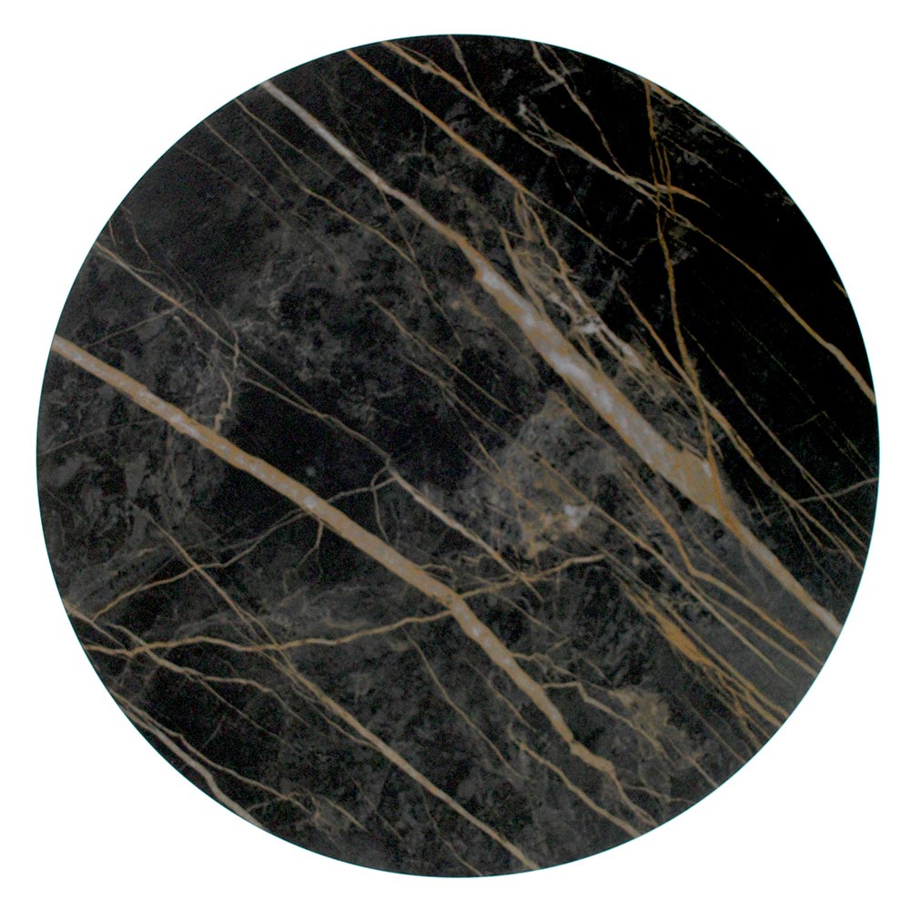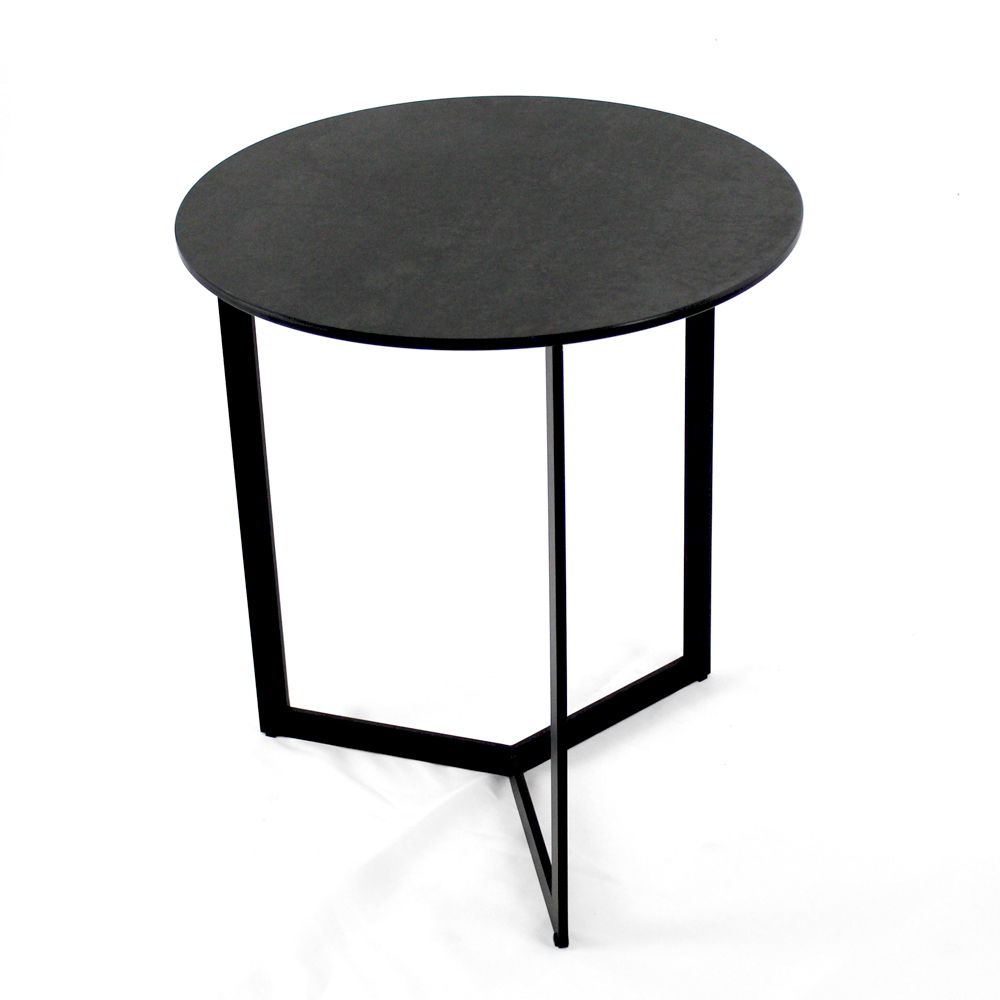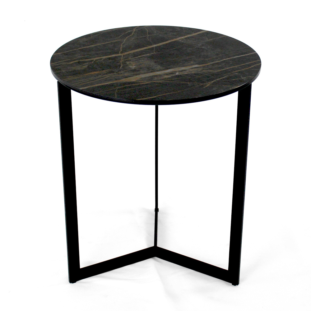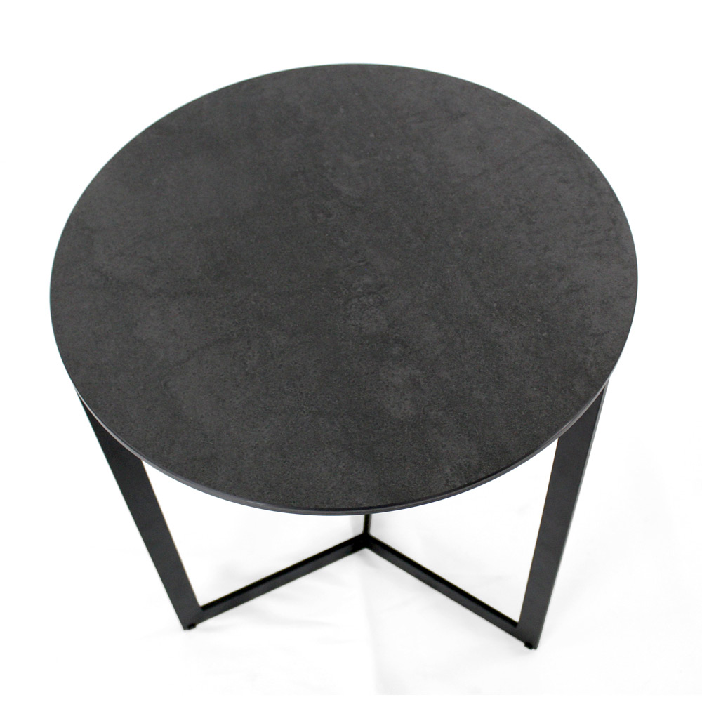 Runt soffbord med underrede i målat stål och skiva i grès porslinsstengods