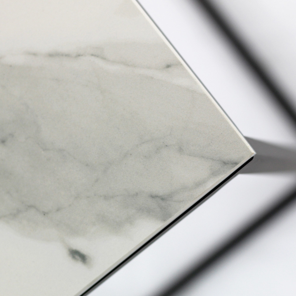 Fyrkantigt soffbord med lackerad stålfot och topp i 3 mm matt ådrad statuär vit stengods laminerad med 6 mm floatglas. Soffborden i modern stil representerar den perfekta möbeln för att fullborda dekorationen av alla vardagsrum och vardagsrum. Dessa produkter är unika, eleganta och funktionella på samma gång tack vare deras enkla och harmoniska finish som gör dem lämpliga för alla behov och användningstillfällen. Materialen som används för konstruktionen garanterar hög kvalitet och motstånd även med tiden.