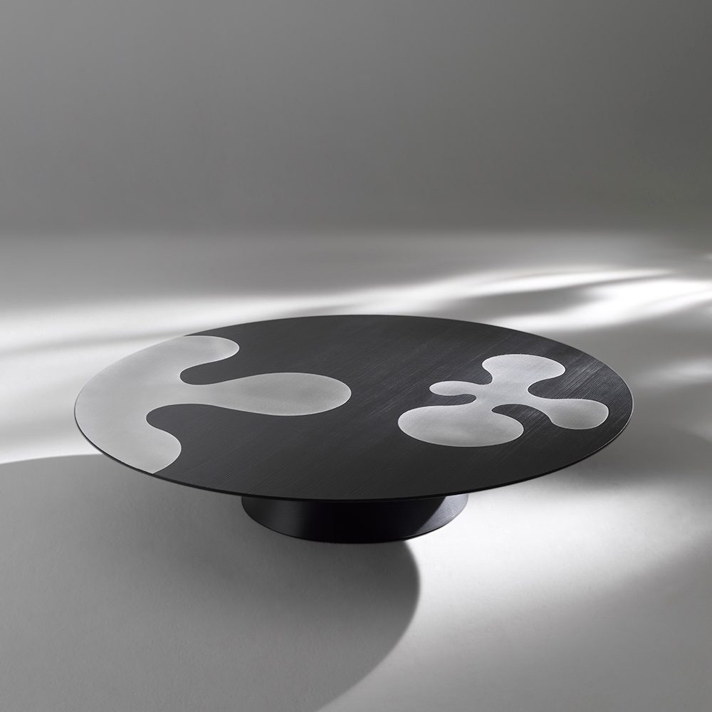 Soffbordet är tillverkat av svartlackerad lärk och framhäver träets rika färg och textur, medan metalldetaljer skapar fina reflektioner som fångar ljuset och berikar kompositionen. Den centrala basen ger stabilitet och förstärker den övergripande skulpturala känslan.