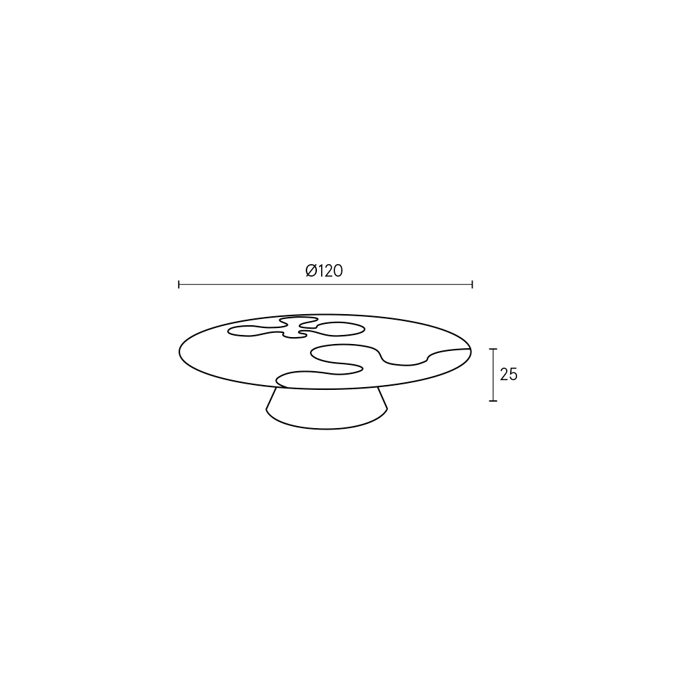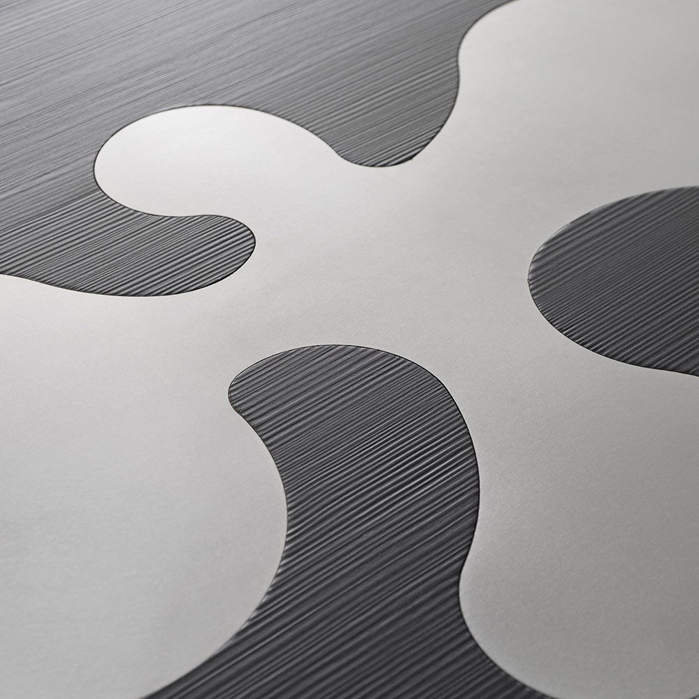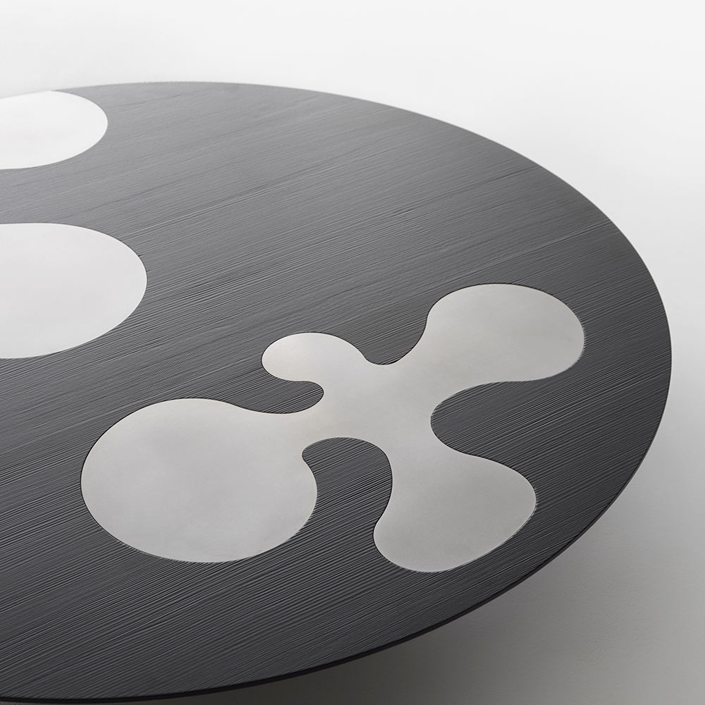 Detta runda designade soffbord utmärker sig med sin grafiska, moderna estetik, där rigorösa former möter ett raffinerat samspel av kontrasterande material. Den runda skivan blir en verkligt uttrycksfull yta, med satinerade inlägg i rostfritt stål som sticker ut ur den mörka bakgrunden som abstrakta, dynamiska motiv.