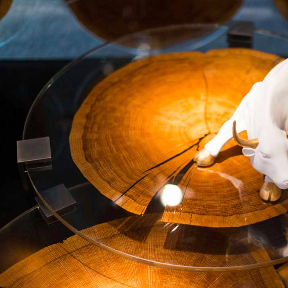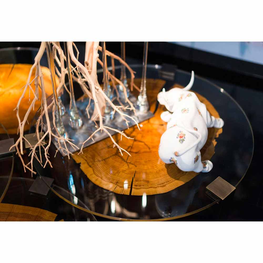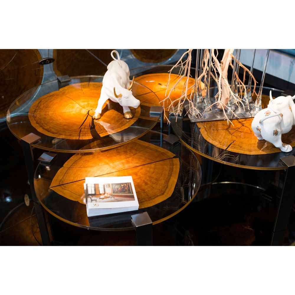 Soffbord gjord i Italienmed rund topp i kopplat glas (5 + 5 mm) inuti vilken en tunn sektion av slutskuren trä sätts in, uppburen av 3 metallben med polerad mässingsfinish . Från den exklusiva kombinationen av den raffinerade beröringen av glas, de underbara färgerna i trä och den moderna estetiken i metall, skapas en unik inredningslösning som bygger sin idé på begrepp av innovation och elegans för ett avantgardistiskt resultat med en stark personlighet. samtida . Dess styrka representeras av den perfekta kombinationen av ytbehandlingar och material som ökar värdet på soffbordet utan att försumma den grundläggande funktionella aspekten som understryks av 100% tillverkningen i Italien och användningen av kvalitetsråvaror vilket gör det möjligt att erbjuda ett inredningstillbehör med en revolutionerande skönhet och samtidigt särskilt solid och motståndskraftig .
