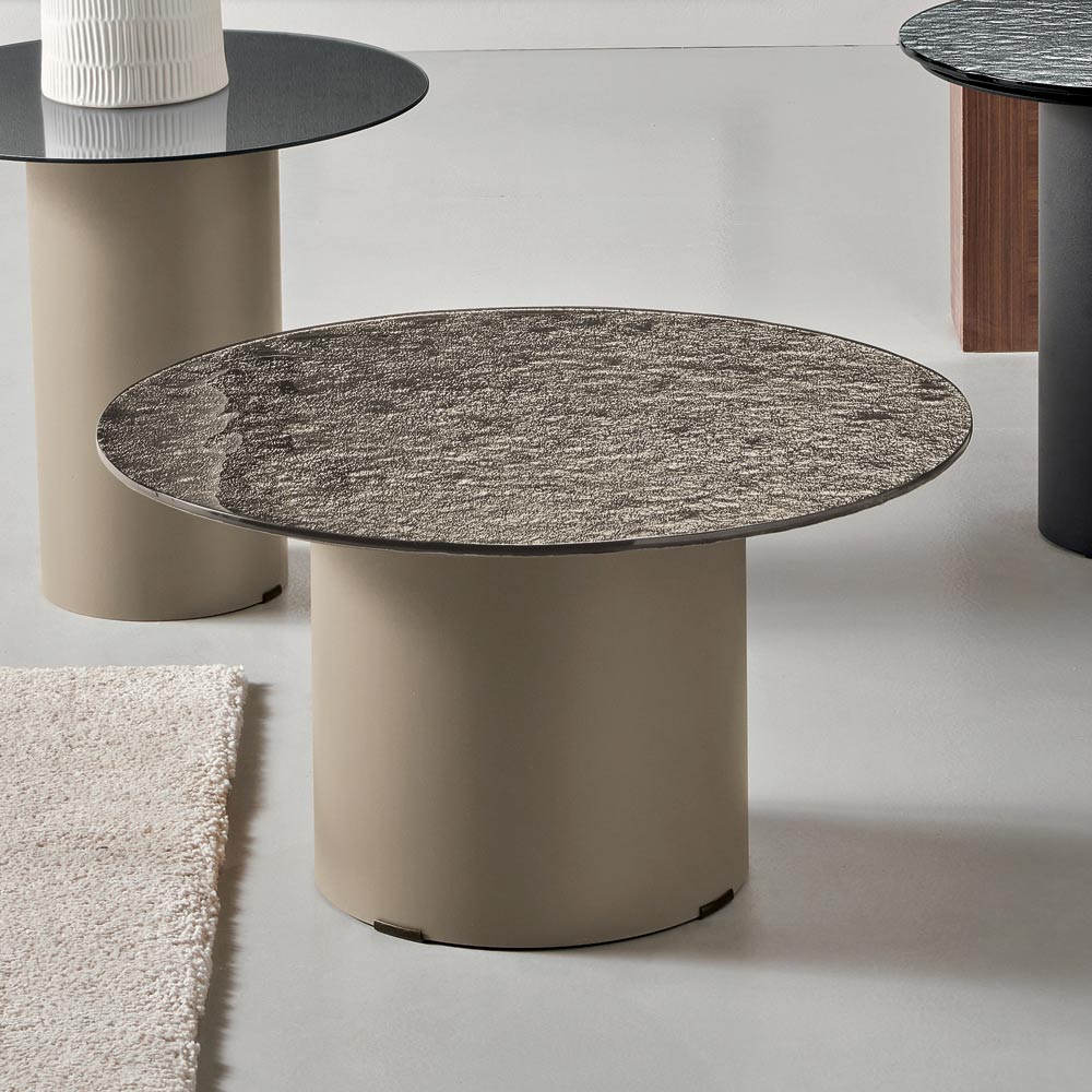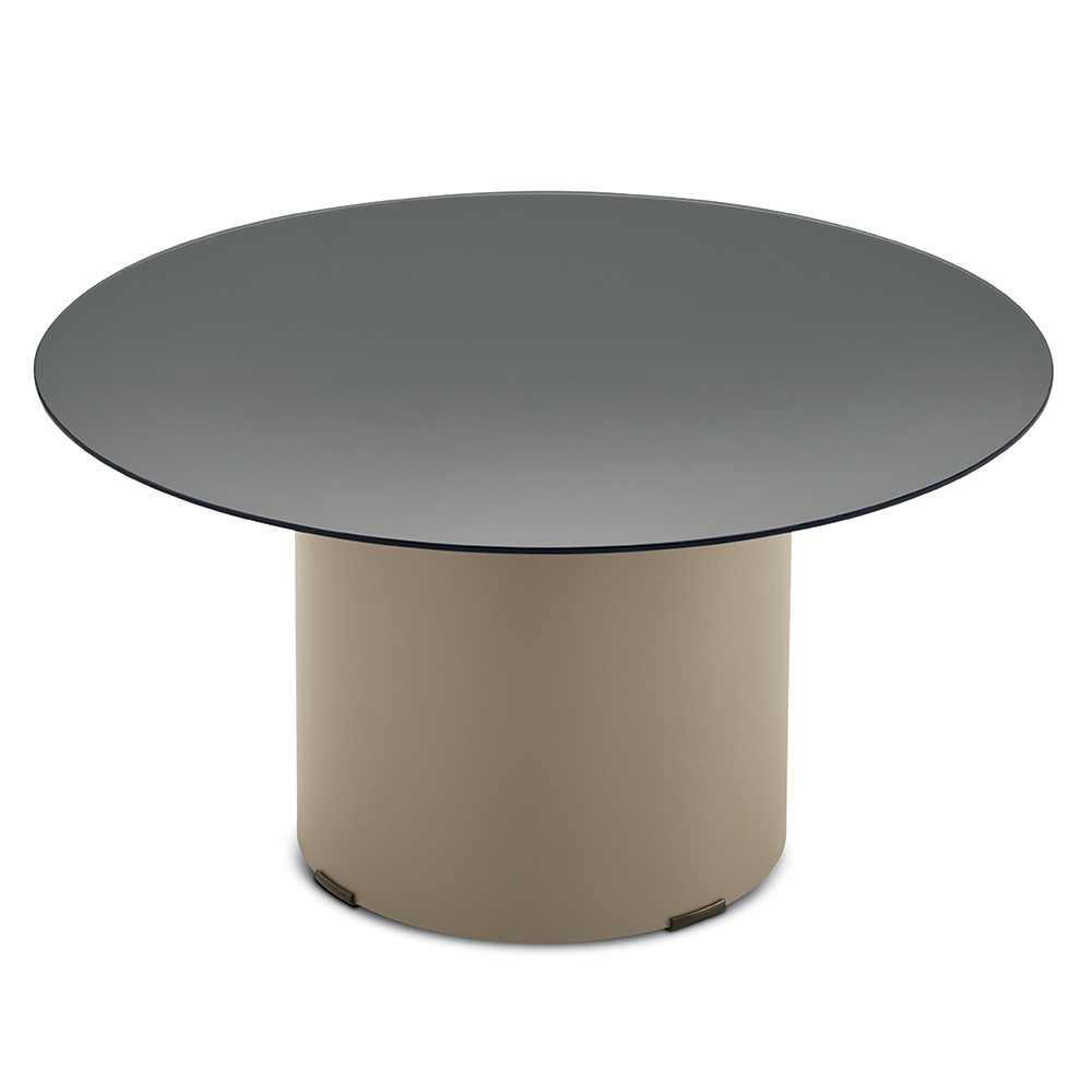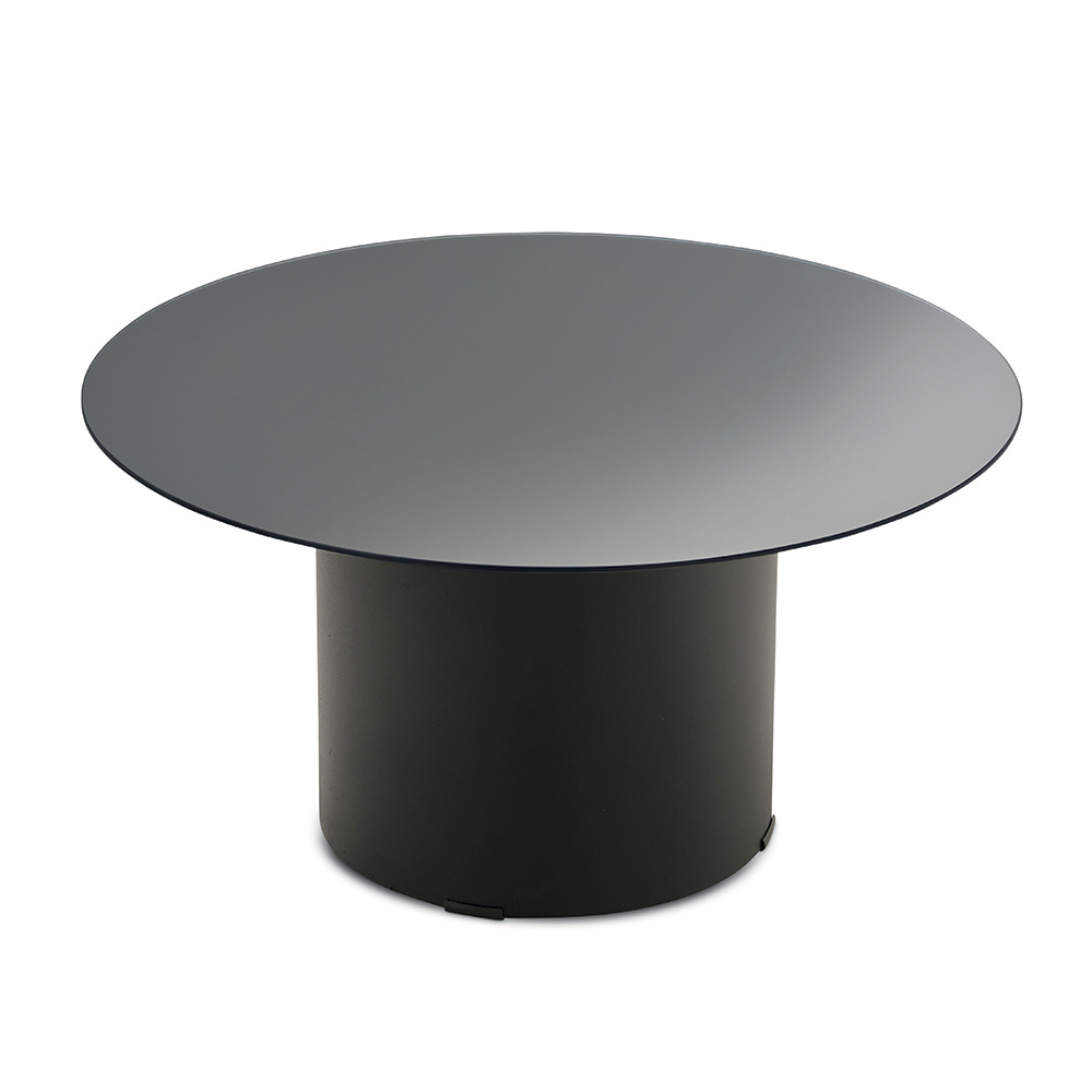 Strukturen har en cylindrisk, målad metallbas , solid men visuellt lätt, som balanserar toppen. Denna kontrast mellan solida volymer och tunna ytor skapar en modern och elegant estetik, perfekt för sofistikerade utrymmen.