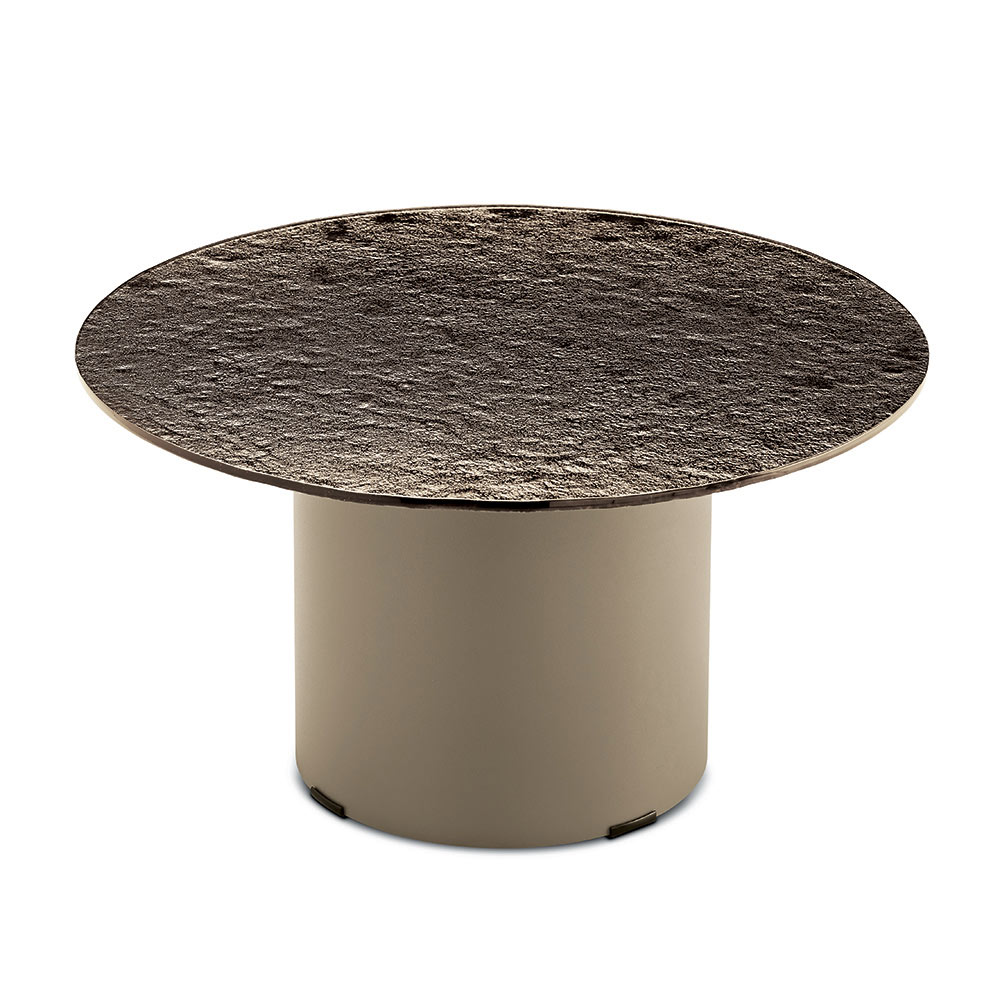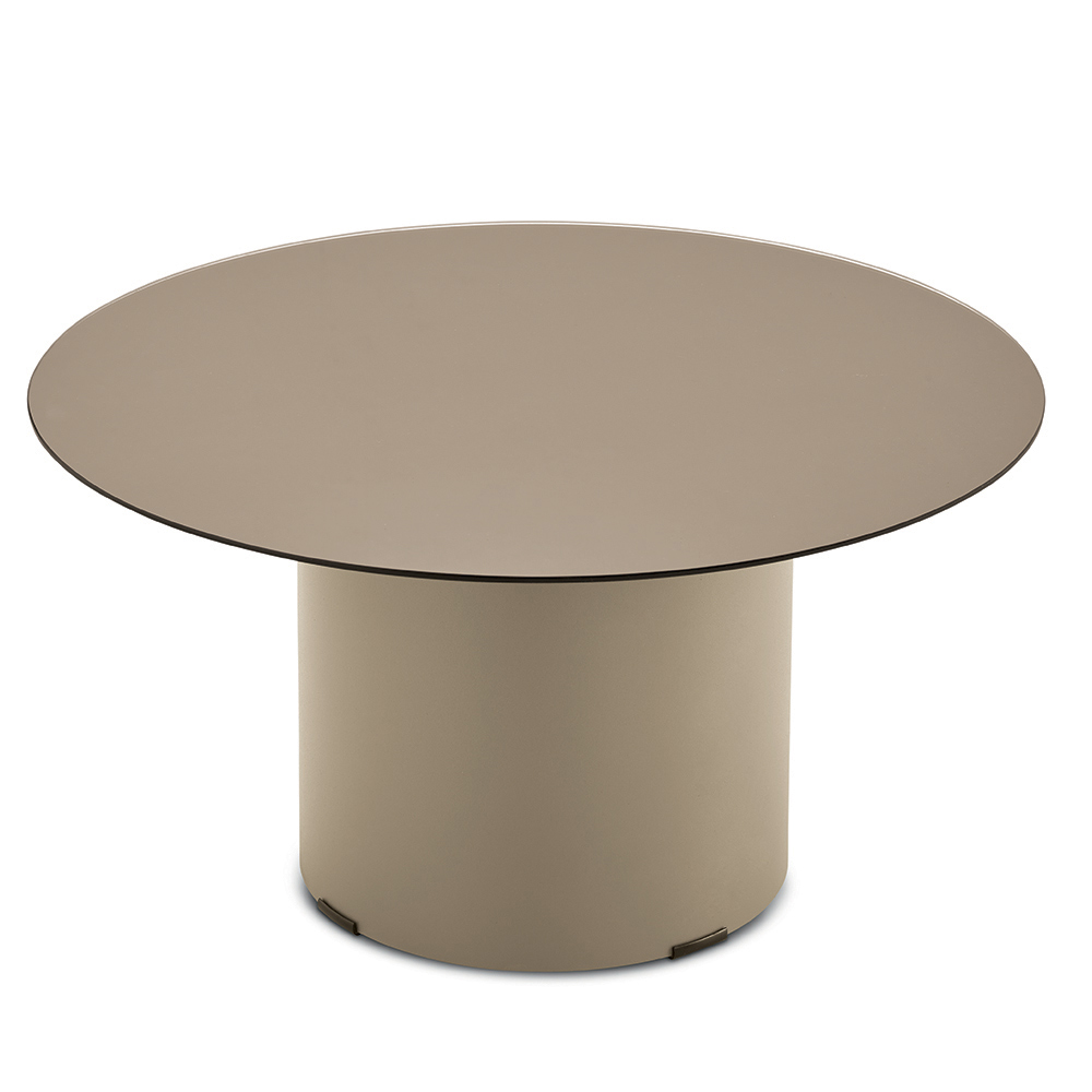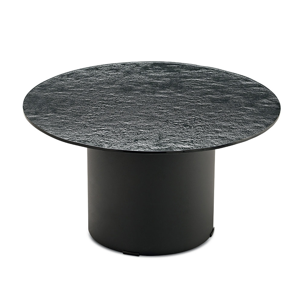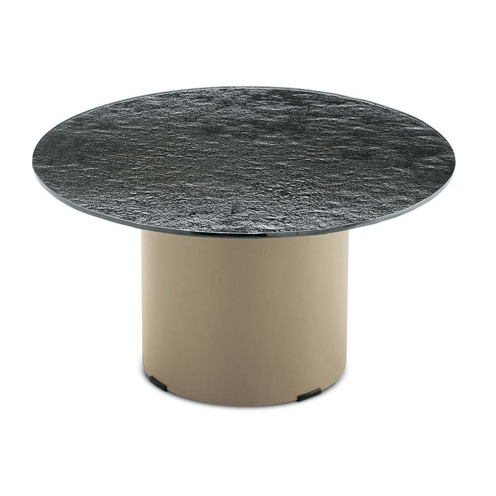 Strukturen har en cylindrisk, målad metallbas , solid men visuellt lätt, som balanserar toppen. Denna kontrast mellan solida volymer och tunna ytor skapar en modern och elegant estetik, perfekt för sofistikerade utrymmen.