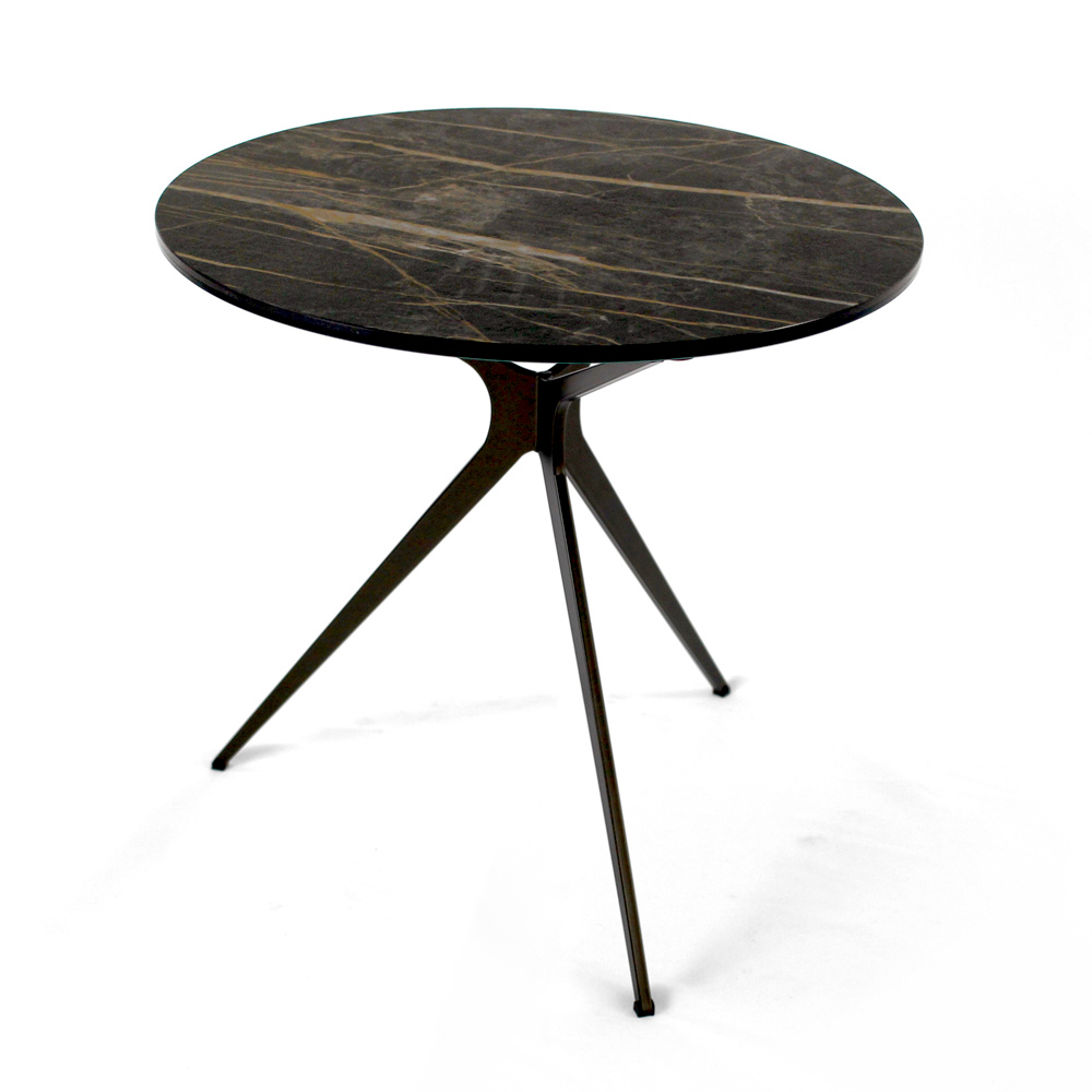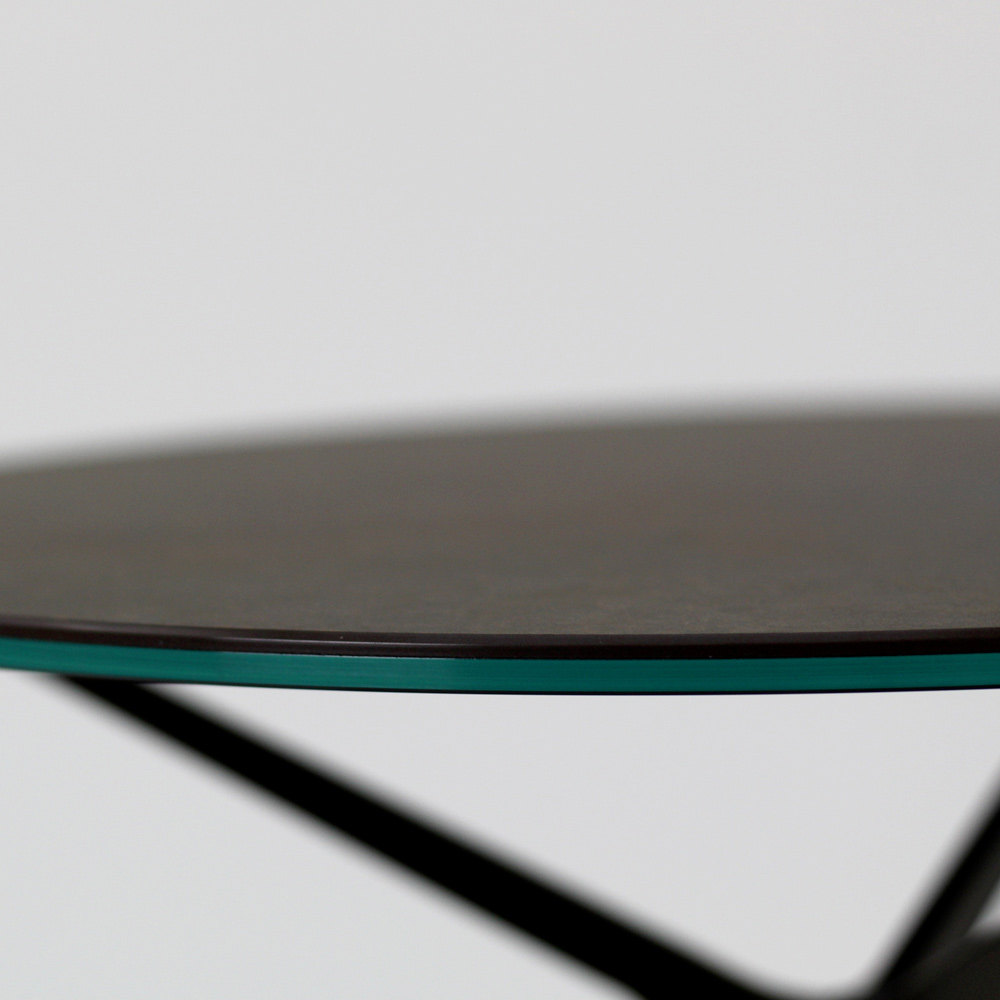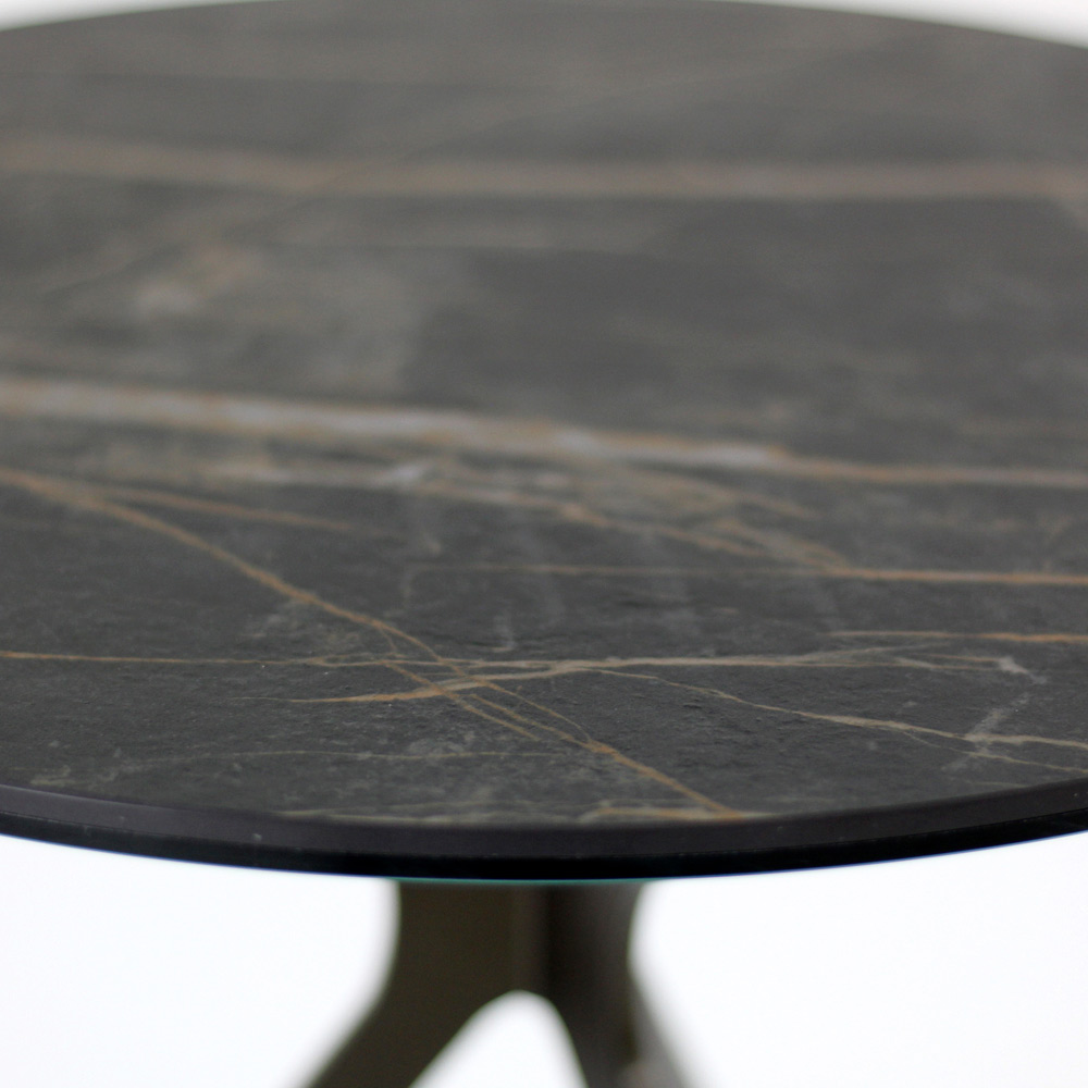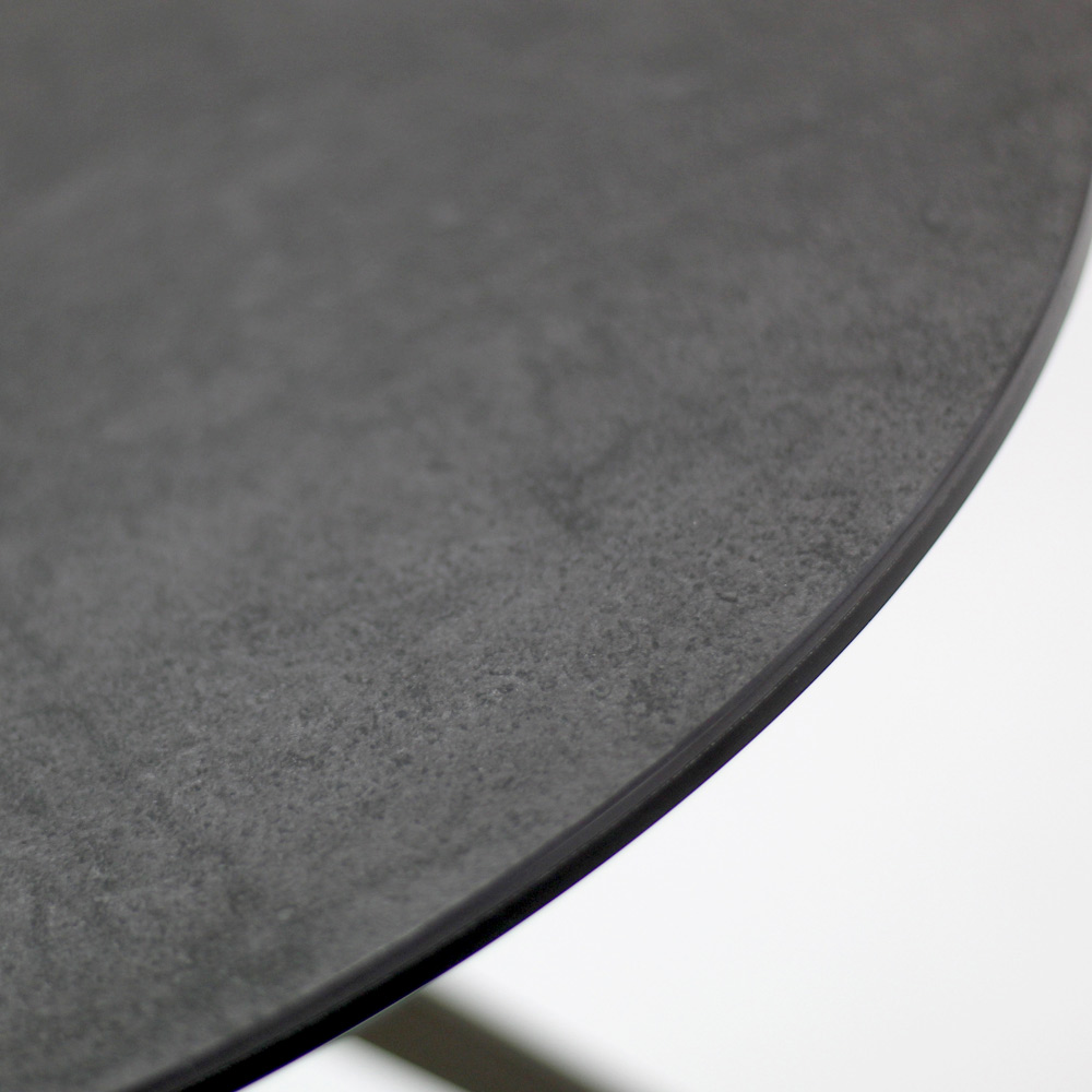 Runt soffbord med lackerad stålfot och topp i porslin i stengods.