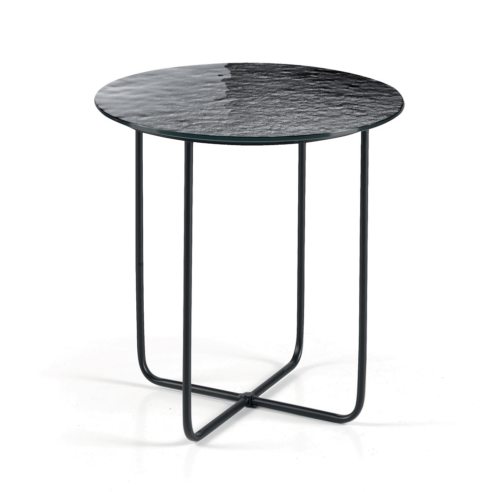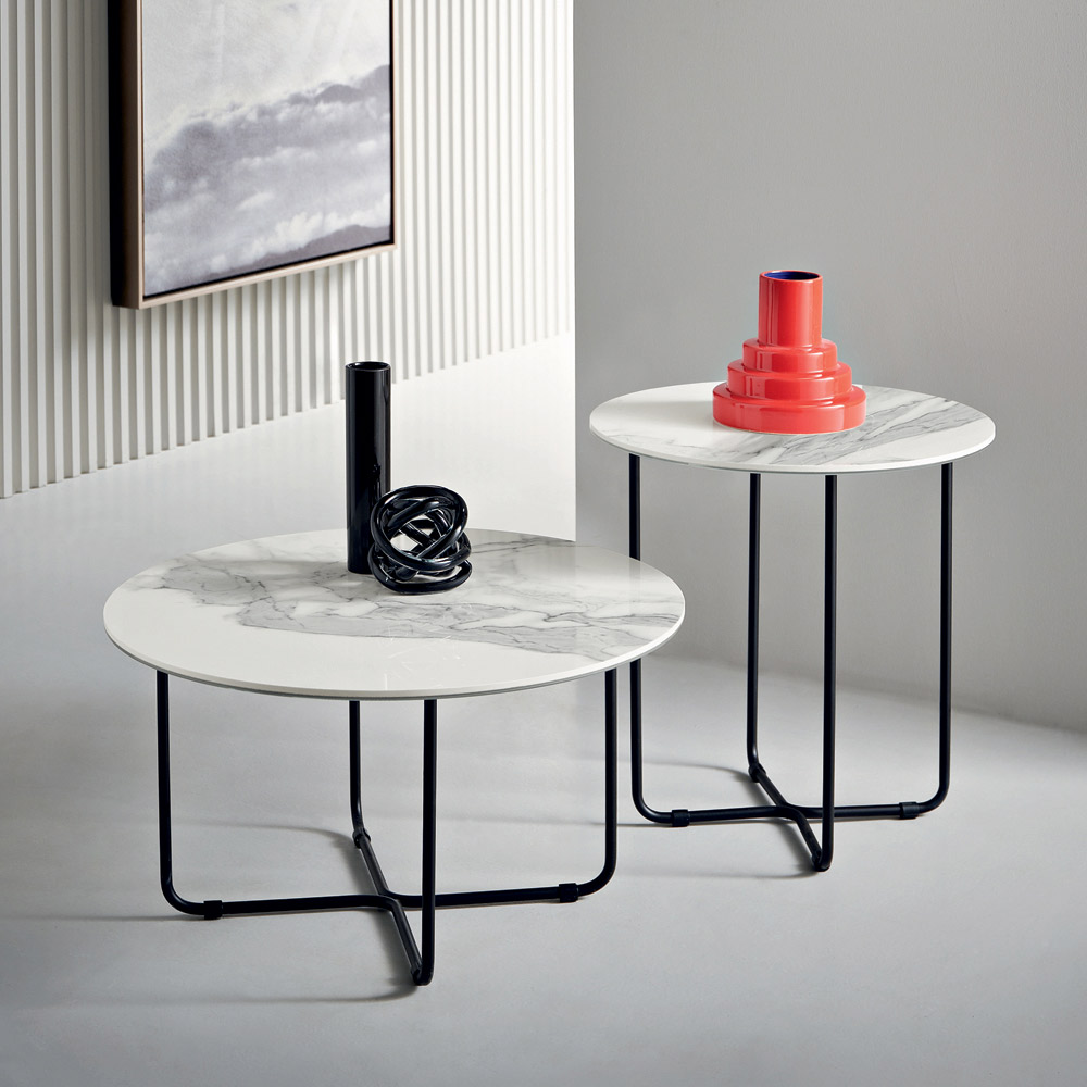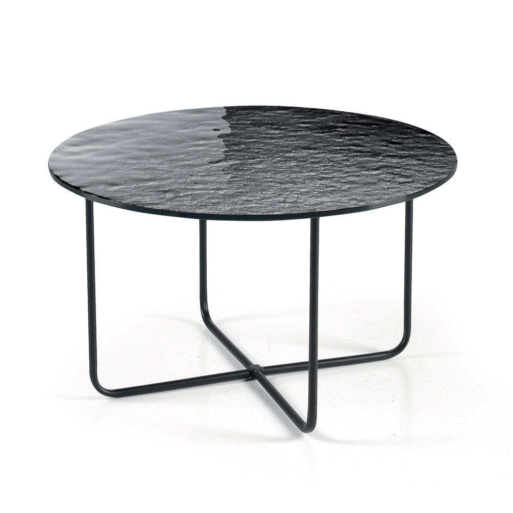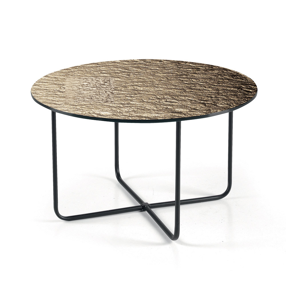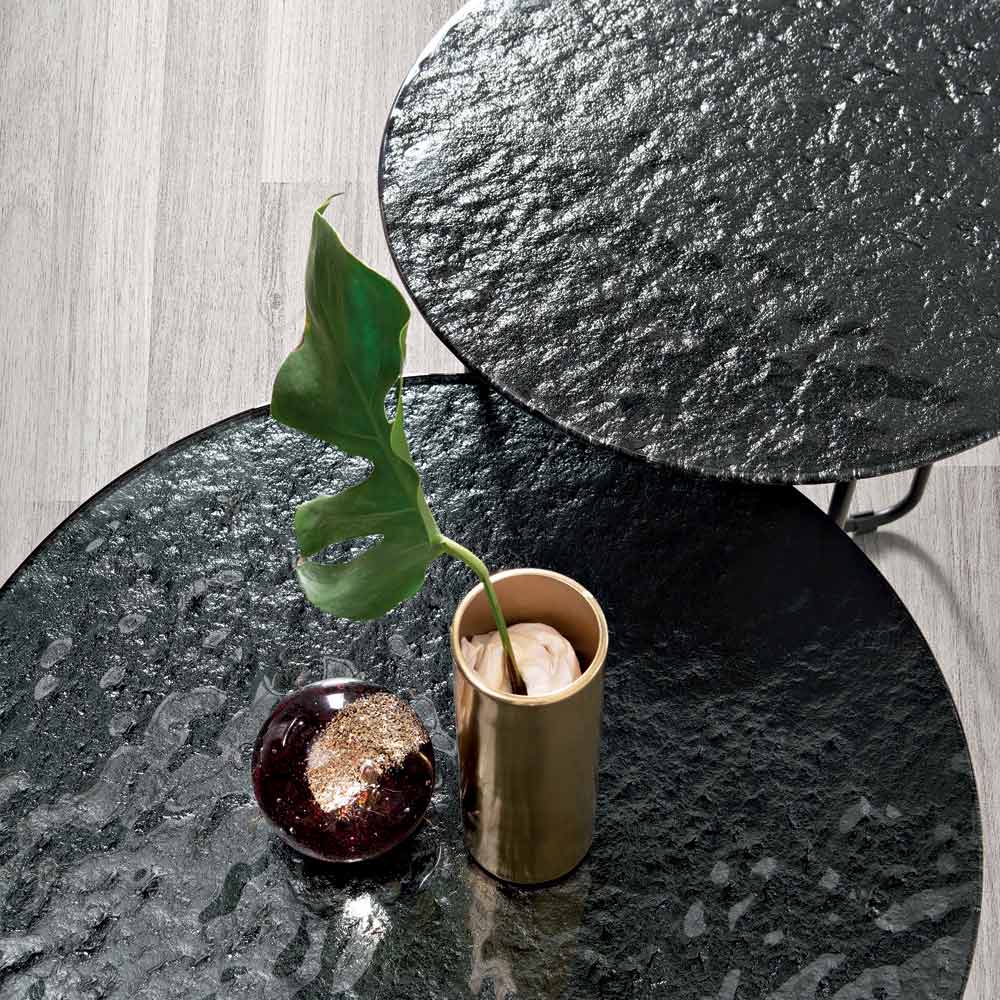 Bordskivan finns i försilvrat hamrat glas med baksida , vilket förstärker rummets ljusstyrka, eller i marmorliknande keramik ovanpå glas , en lösning som kombinerar hållbarhet och estetisk förfining. Detta dubbla alternativ låter dig anpassa bordet så att det passar rummets stil.