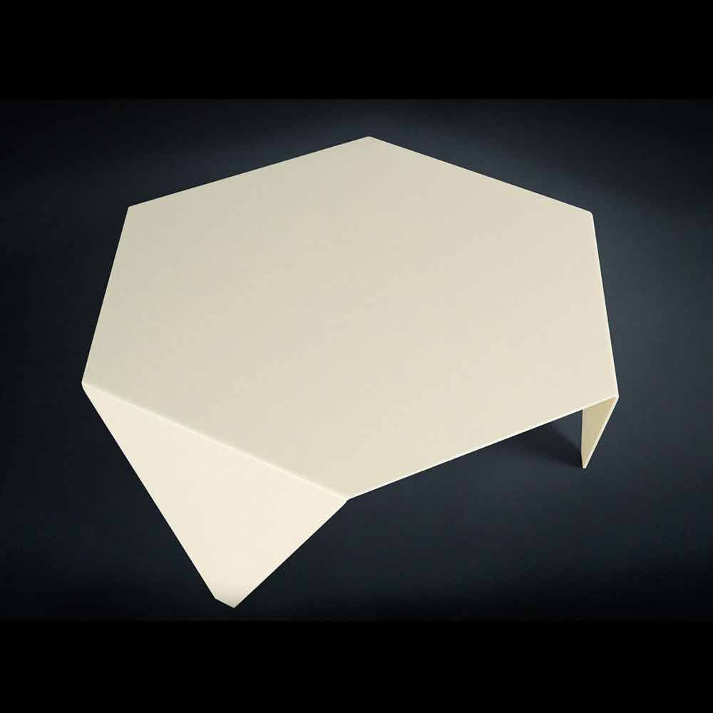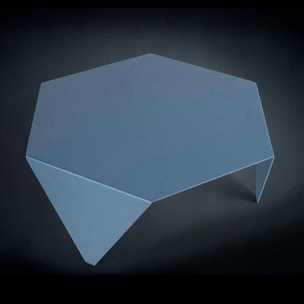En annan egenhet av denna soffbord är den sexkantiga formen på sin plan, vilket ger honom möjlighet att jämföras med andra delar för att skapa geometriska former alltid annorlunda; stöds av tre ben som linjärt följer finish och enkel och balanserad utveckling av planen. Ruche ger sin unika design.
