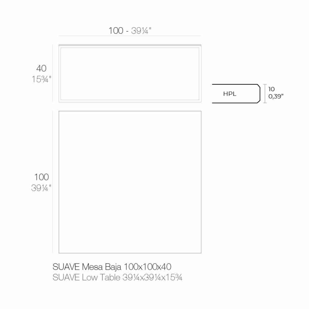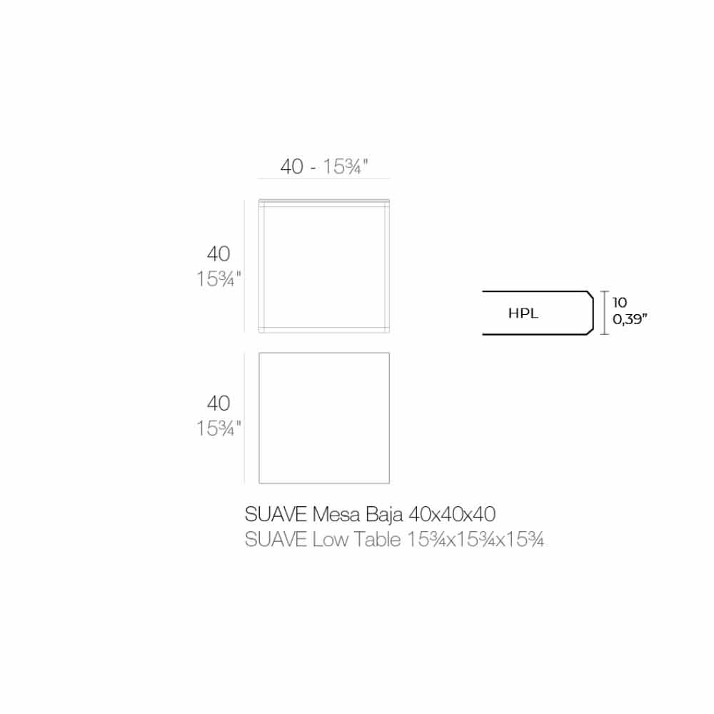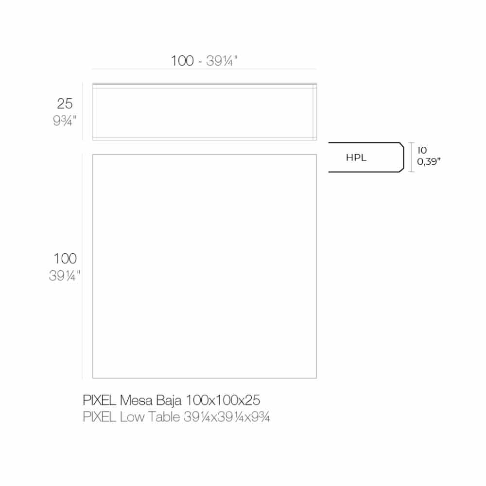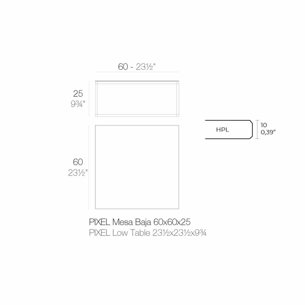 Fyrkantigt soffbord för trädgårdsloungen i aluminium och svart hpl-topp, 4 storlekar och 2 höjder.