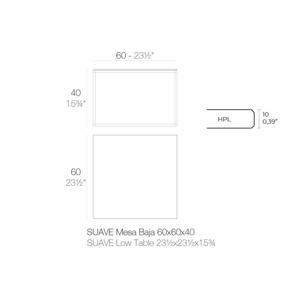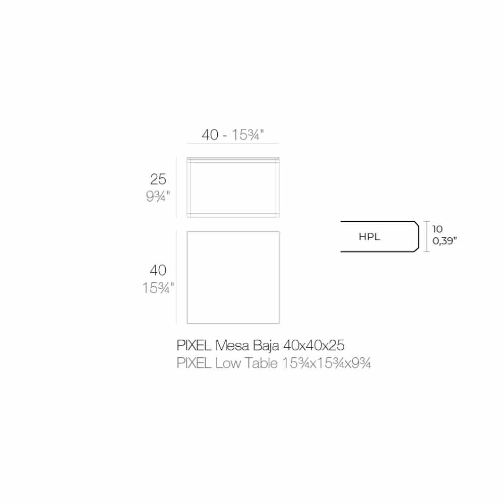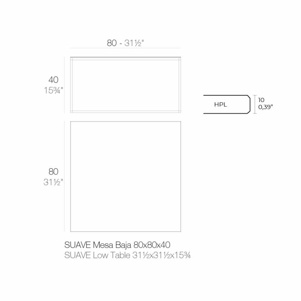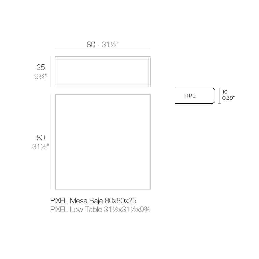 Fyrkantigt soffbord för trädgårdsloungen i aluminium och svart hpl-topp, 4 storlekar och 2 höjder.