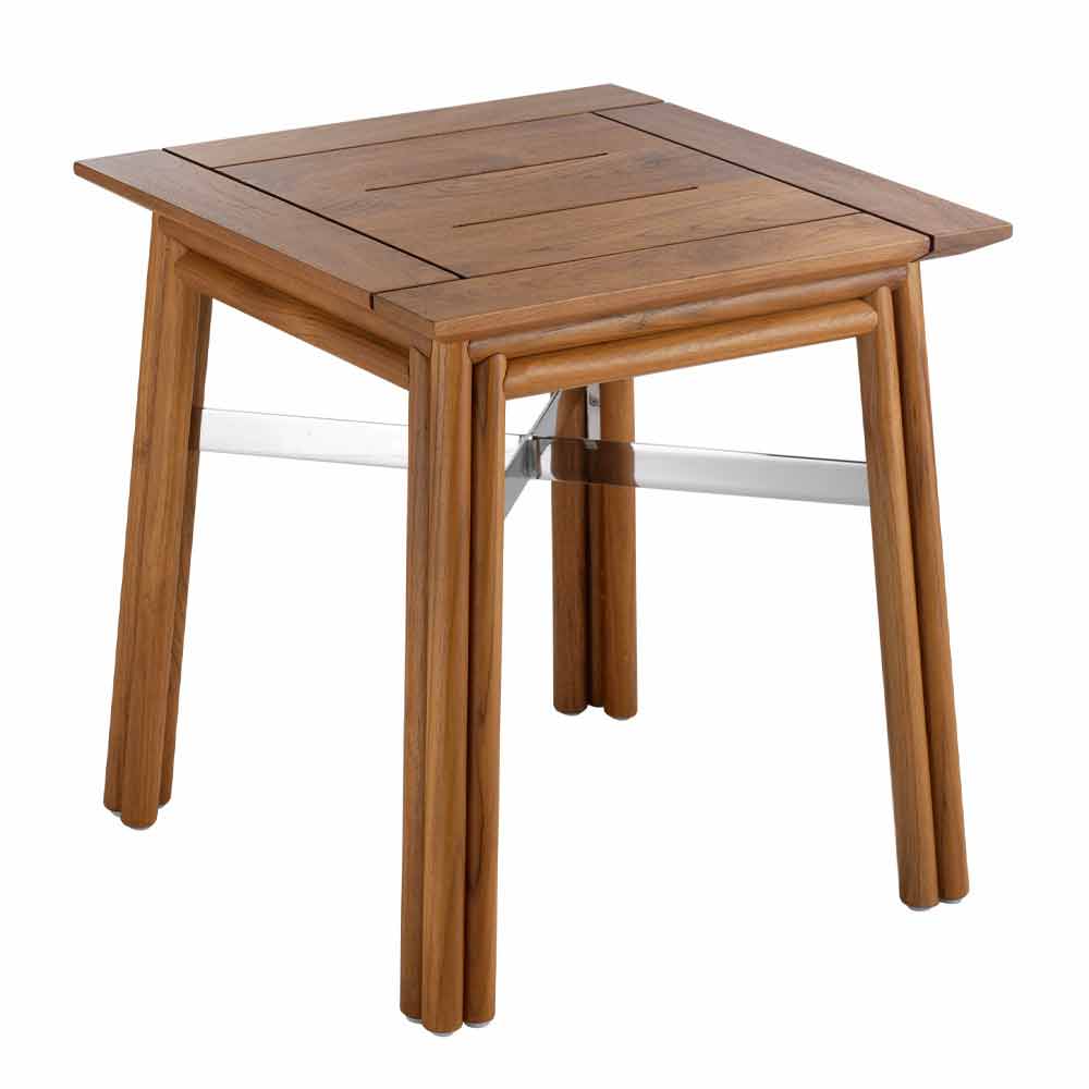 fin träram med ett X-kors som stöder konstruktionen. De eleganta och rena linjerna anpassar sig till både utomhus- och inomhusutrymmen och är inspirerade av båtvärlden. Träet är valt för sina egenskaper av värme och charm och finns i två olika ytbehandlingar,