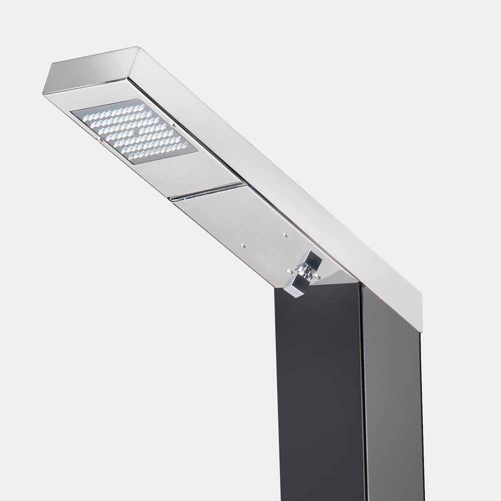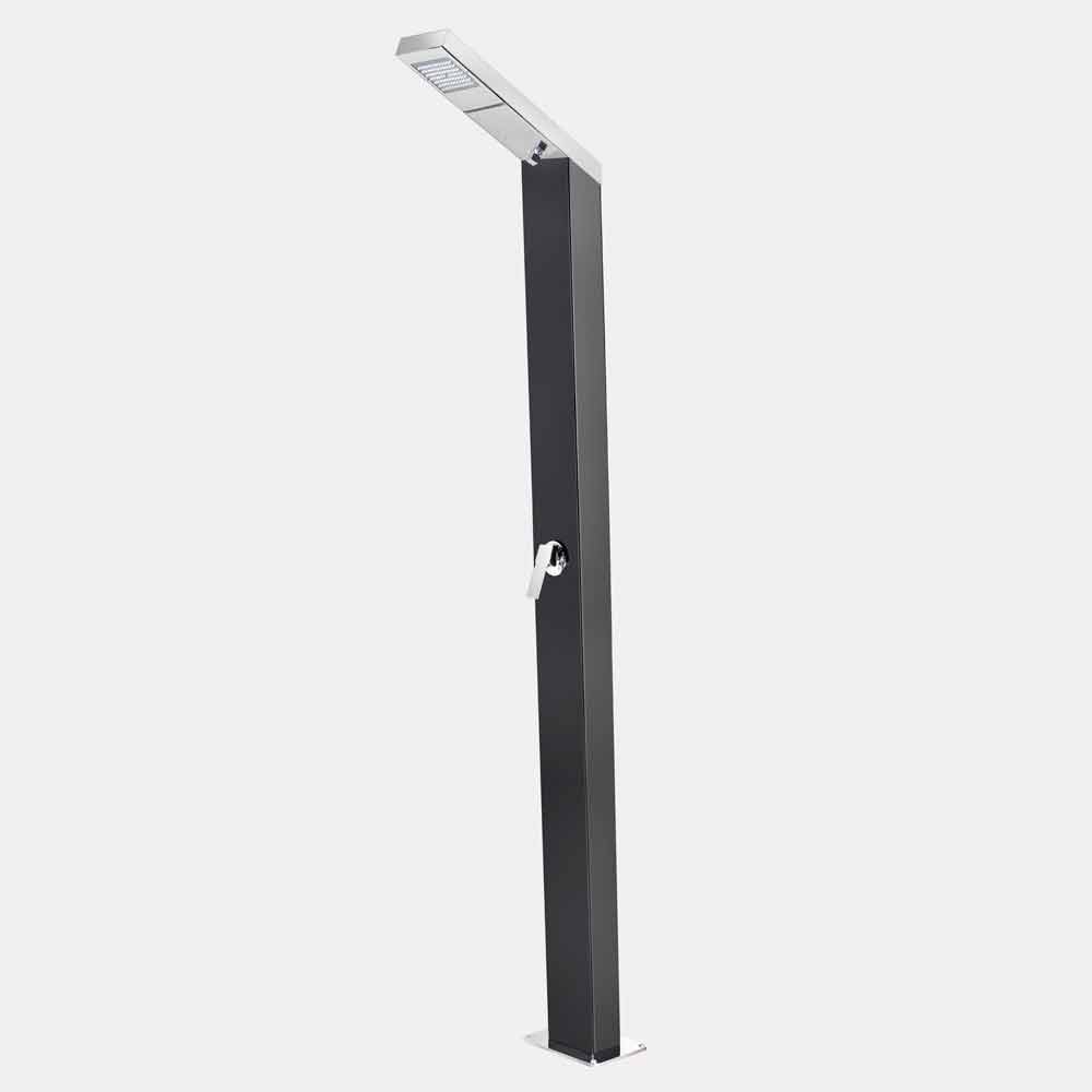 Denna produkt uttrycker elegansen i sina former och linjer tillsammans med hög teknisk potential i varje utomhusmiljö, och skapar därmed den perfekta utomhusduschpelaren som kan tillgodose både estetiska och funktionella behov. De två strålarna, regn och vattenfall, erbjuder en underbar avslappnande massage och bidrar till att skapa ett litet hörn tillägnat avkoppling i utomhusmiljöer som badorter och turistanläggningar, men även privata miljöer som simbassänger och trädgårdar. Dess rektangulära sektionsstruktur möjliggör en stor värmeabsorptionsyta, vilket lyckas hålla vattnet varmt hela dagen. För detta ändamål är det också viktigt att placera duschen i ett öppet och särskilt soligt område för att låta solstrålarna värma upp vattnet inuti tanken på bästa sätt.