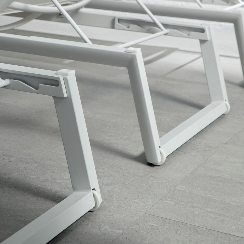 Solstol utomhus med epoxipulverlackerad aluminiumstruktur kombinerat med textilennät med lutande ryggstöd upp till 4 positioner med infällbara hjul, utmärkt för att säkerställa stor rörlighet för denna produkt.