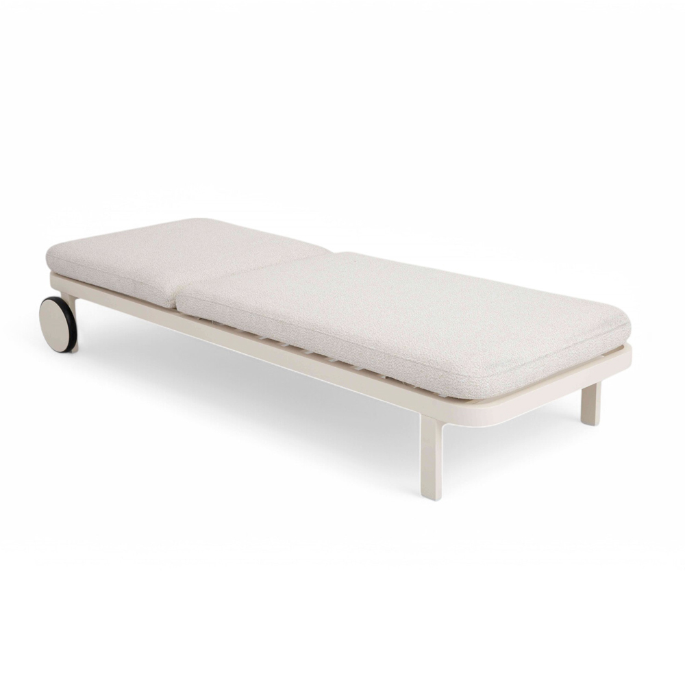 Den minimalistiska designen berikas av tankeväckande detaljer, till exempel de integrerade hjulen som gör det enkelt att flytta den vart du vill, efter dina stunder av avkoppling i solen eller skuggan. Den vadderade madrassen, täckt av vädertåligt tyg, garanterar extraordinär komfort och hållbarhet över tid.