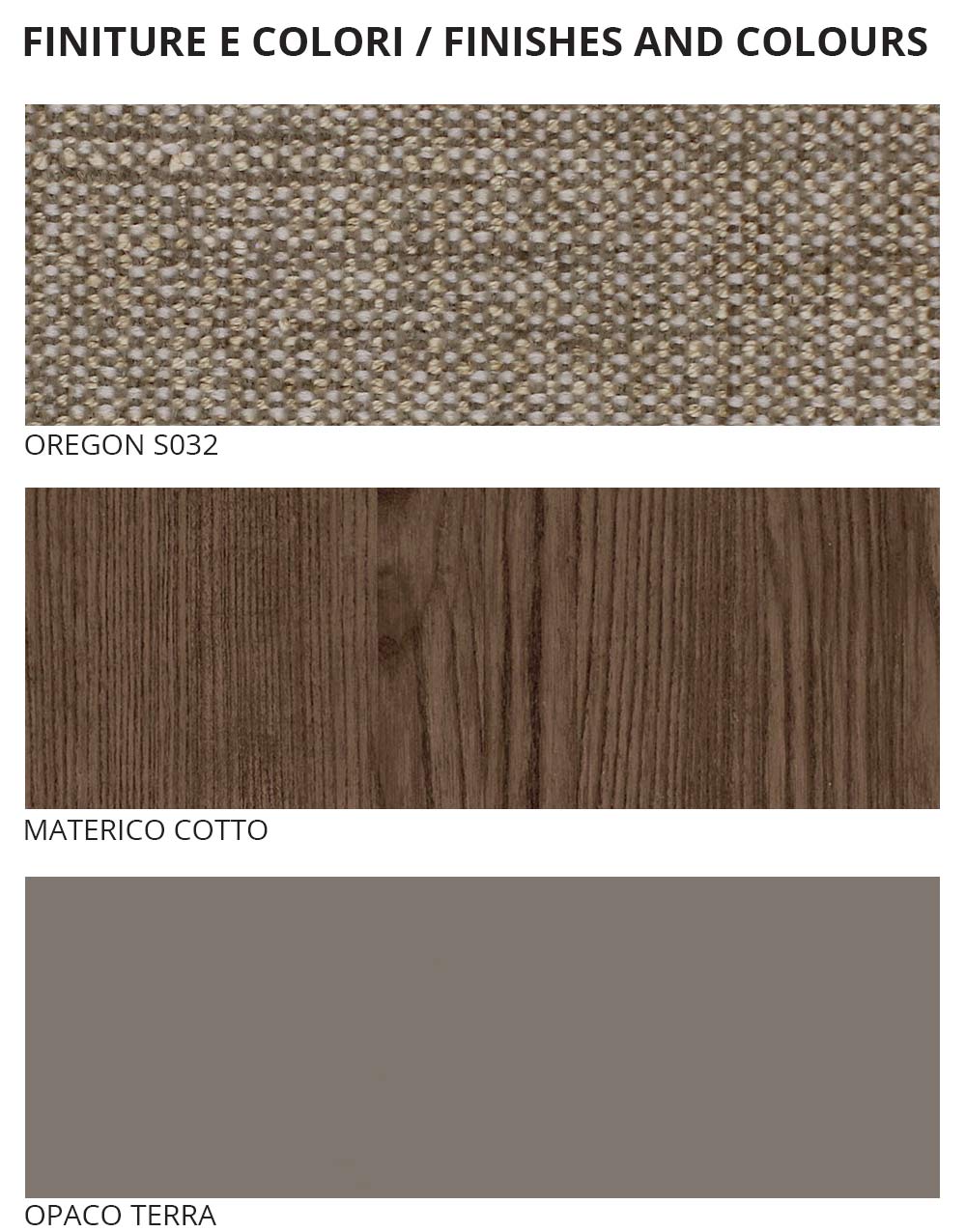 terrakotta och matt terra lackerat trä med öppning genom en praktisk skåra placerad på lådans front. Det säregna representeras av den ovanliga formen på sänggaveln som stänger inåt och återskapar känslan av en lugnande tillflyktsort och också pryds av den raffinerade designen som skapats genom sömmarna på toppen. Tillsammans med sängborden och byrån har den skapade atmosfären en