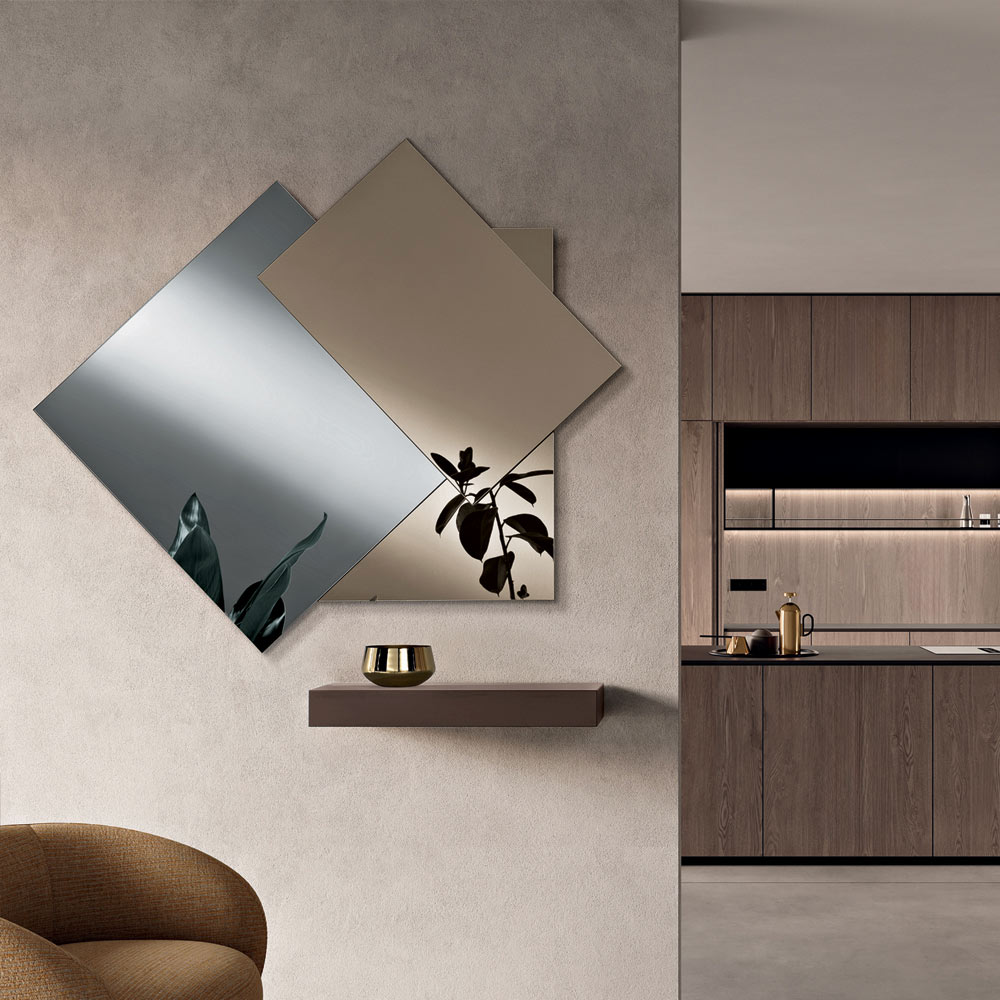 Spegeln består av tre överlappande paneler som skapar ett raffinerat samspel av lager och reflektioner: två element i bronsfärgad finish och ett i rökfärgad finish . Denna komposition skapar en yta som genomkorsas av linjer och geometriska mönster som ger visuellt djup och rörelse till rummet.