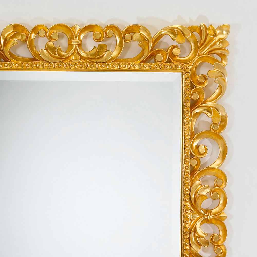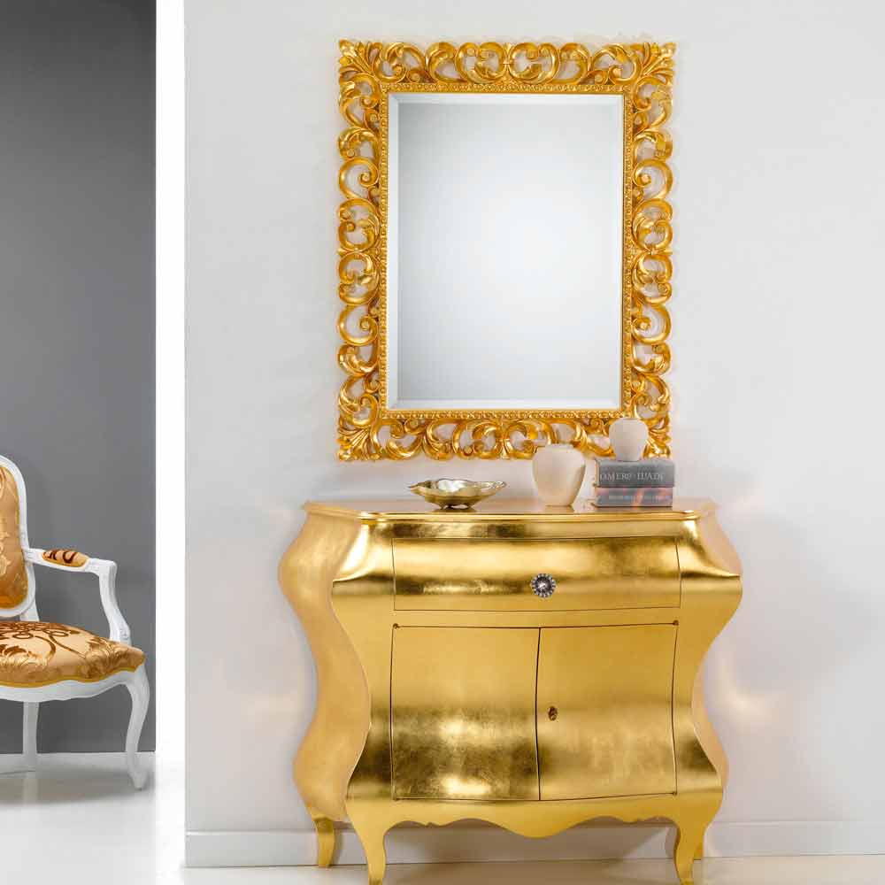 Spegeln Paris kännetecknas av en hantverks genomföras med användning av material av hög kvalitet och med användning av erfarenhet av skickliga italienska hantverkare. Ramen är tillverkad av trä dekorerad med sniderier. bladguld finish. Spegel med avfasade glas, 4mm tjock. Made in Italy. Att hänga antingen vertikalt eller horisontellt.