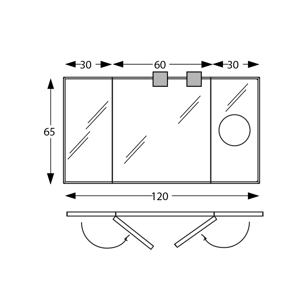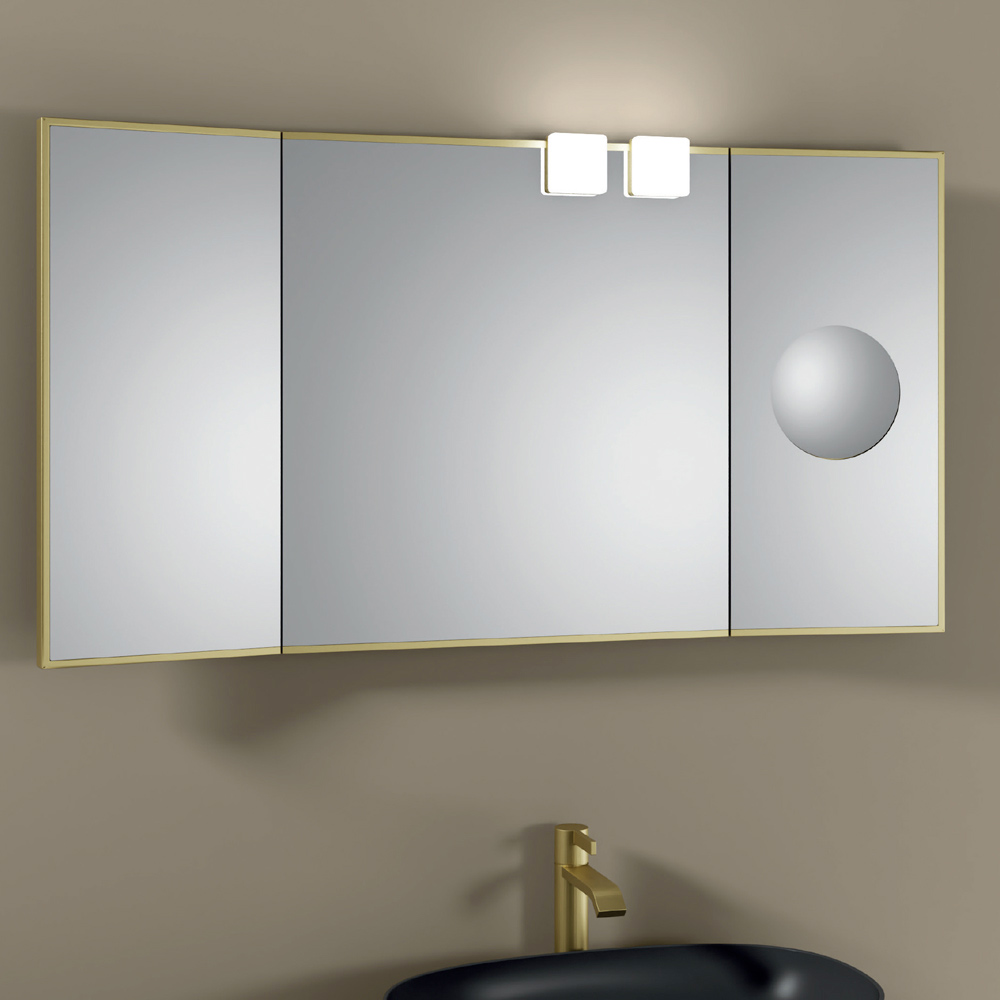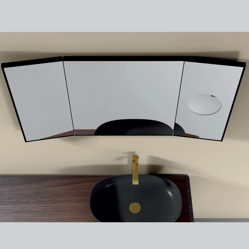De två rörliga sidopanelerna öppnas för att avslöja ytterligare vinklar, vilket möjliggör en komplett och mångsidig vy, perfekt för delade miljöer eller stunder av personlig vård som kräver ett bredare perspektiv. Denna funktion gör spegeln extremt anpassningsbar och anpassningsbar efter behoven hos de som använder den.