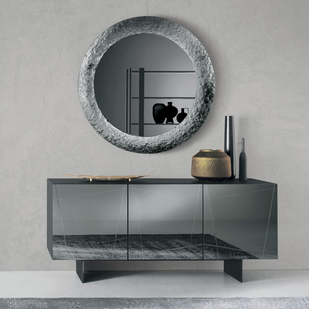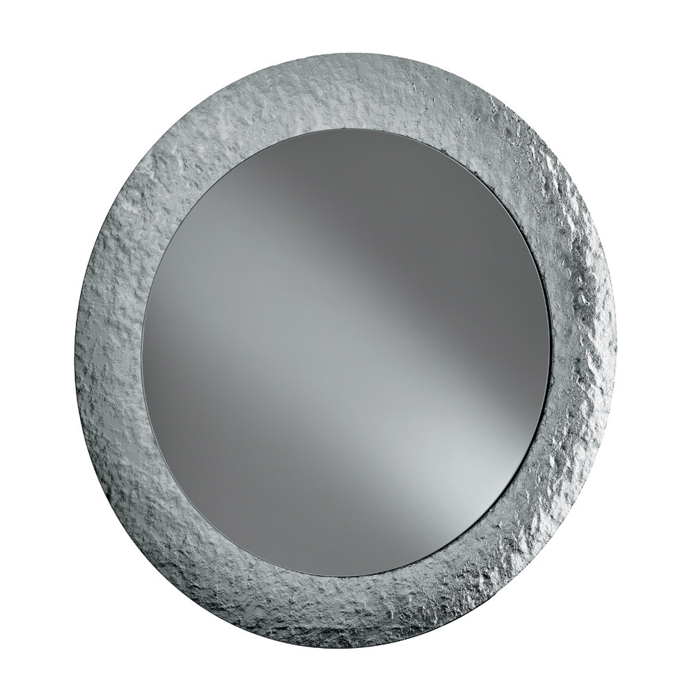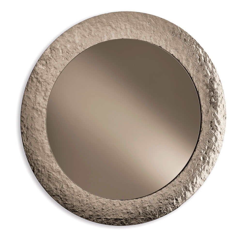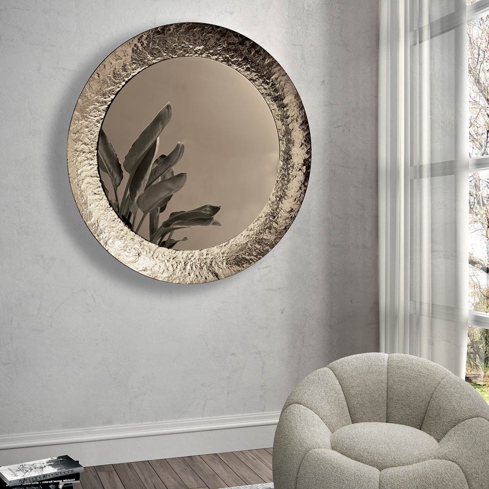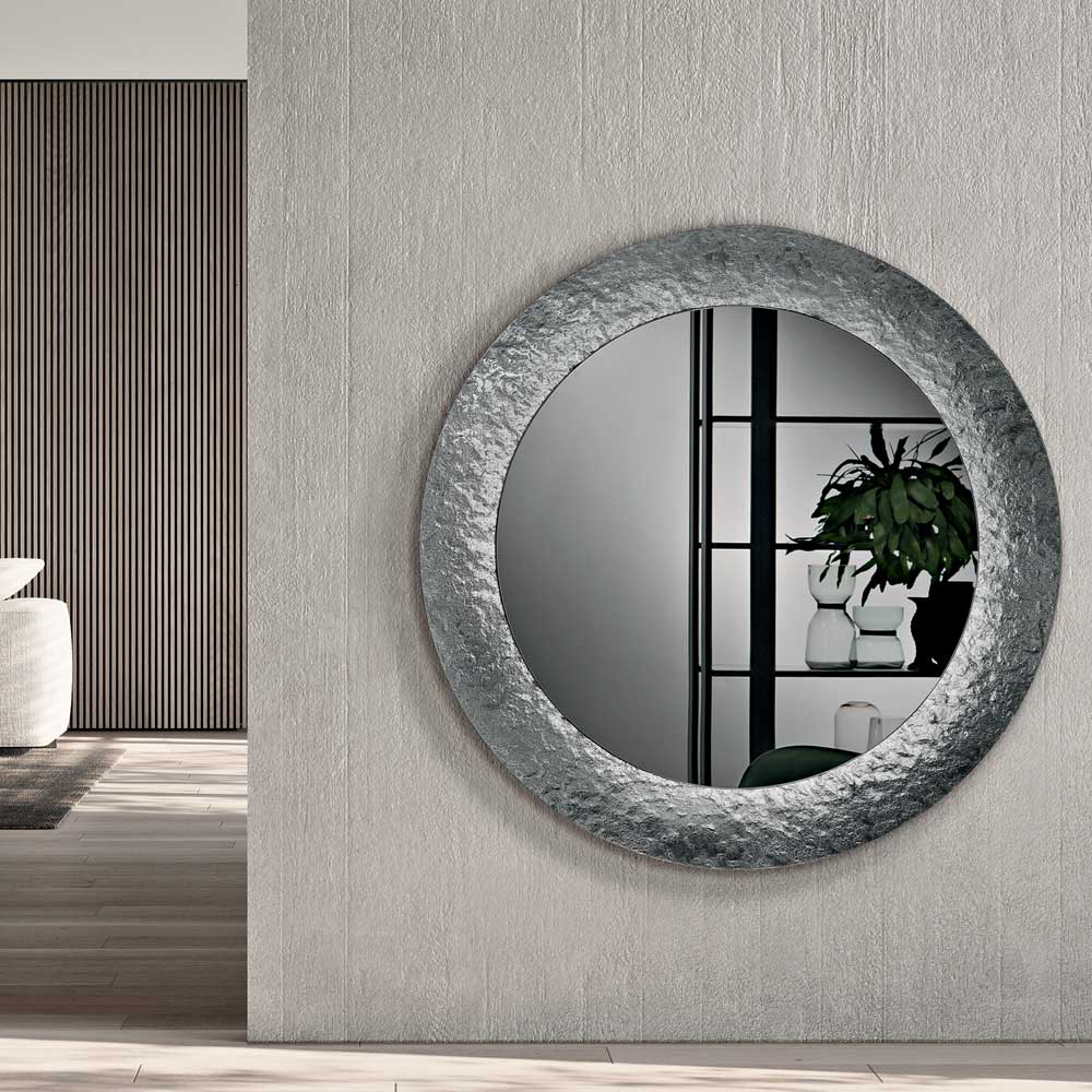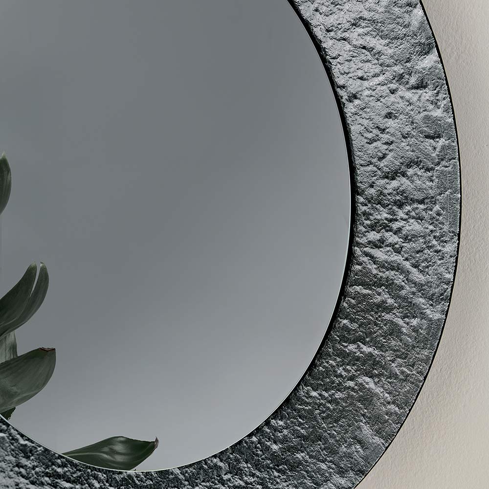 Spegeln har en cirkulär form utsmyckad med en ton-i-ton försilvrad hamrad glasram , vilket ger ytan en livfull, texturerad känsla. Den unika finishen reflekterar ljuset fint och skapar ett elegant samspel som förhöjer rummet utan att vara påträngande.