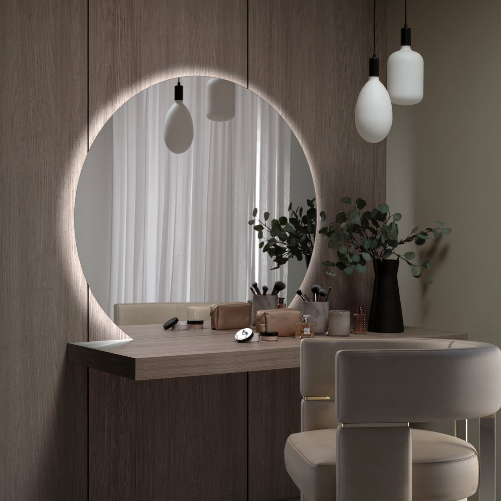 Denna runda spegel är ett designmästerverk som förkroppsligar elegans och modernitet. Bakgrundsbelysningen som följer dess profil ger ett eteriskt sken och ett mjukt ljus som förstärker varje miljö och skapar en intim och raffinerad atmosfär. Spegelns runda form, ett tidlöst stilval, reflekterar och förstärker det naturliga ljuset och skönheten i det omgivande utrymmet. Perfekt för entrén, badrummet eller som en samlingspunkt i ett vardagsrum, denna bakgrundsbelysta spegel är inte bara ett reflekterande element, utan ett riktigt inredningsobjekt som kombinerar form och funktion, skönhet och ljusstyrka, för ett resultat av ren stil och atmosfär .