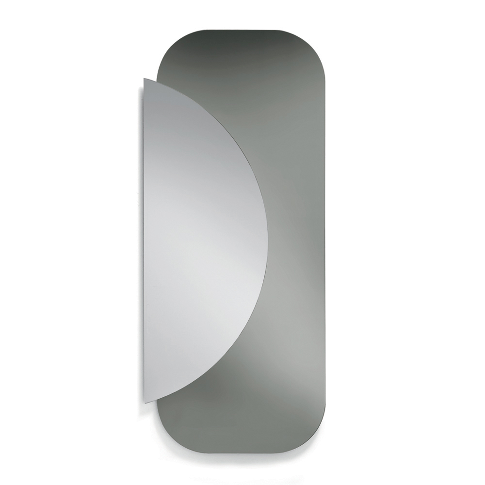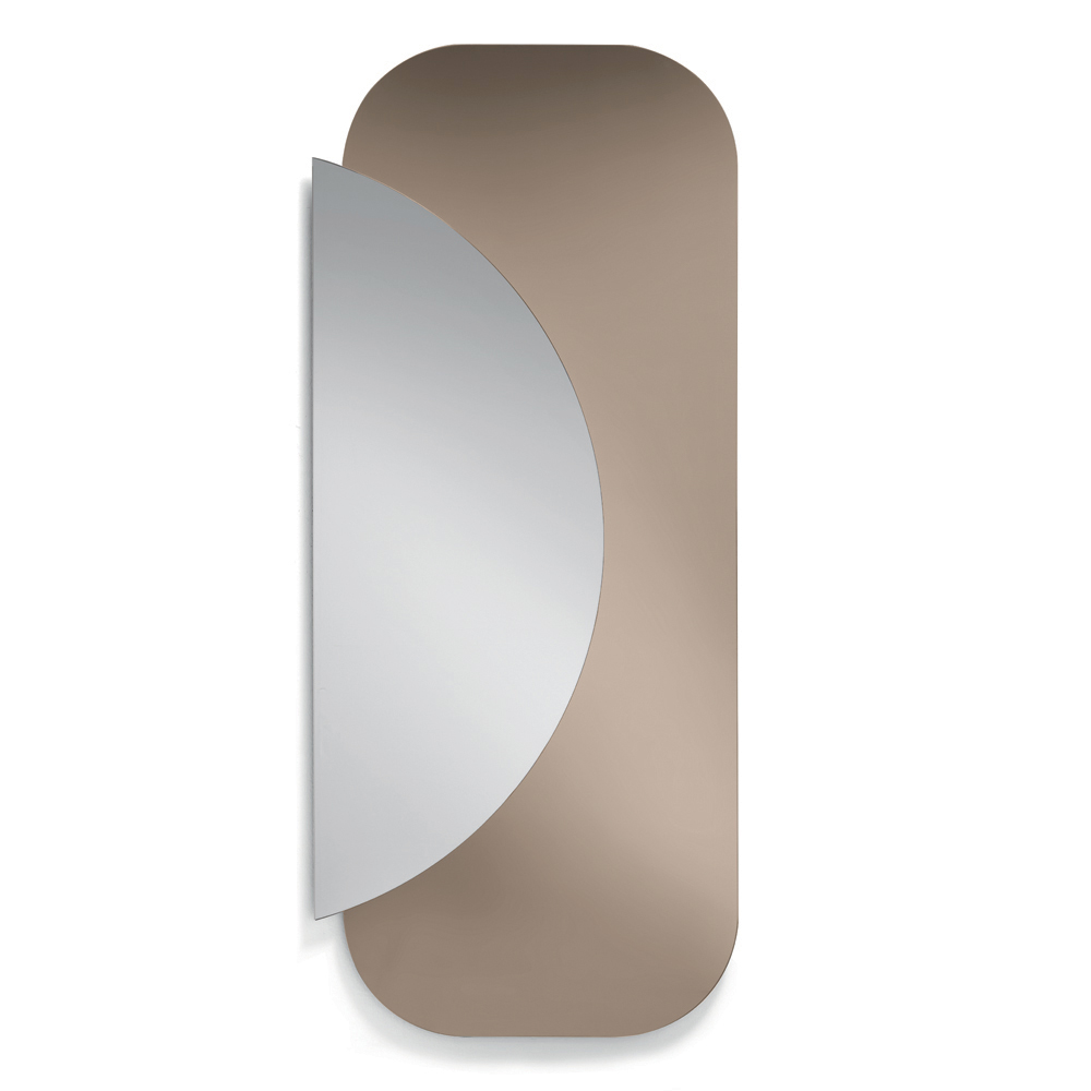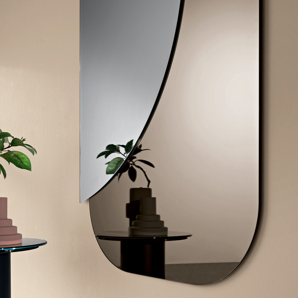 Kompositionen består av två överlappande formade plattor : en rektangulär bas med mjuka hörn och en halvcirkel av naturlig spegel som överlappar varandra, vilket skapar en elegant dialog mellan geometri och reflektioner. Denna kontrast mellan former och material skapar en dynamisk och modern visuell effekt.