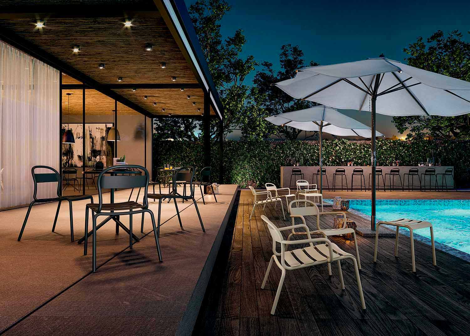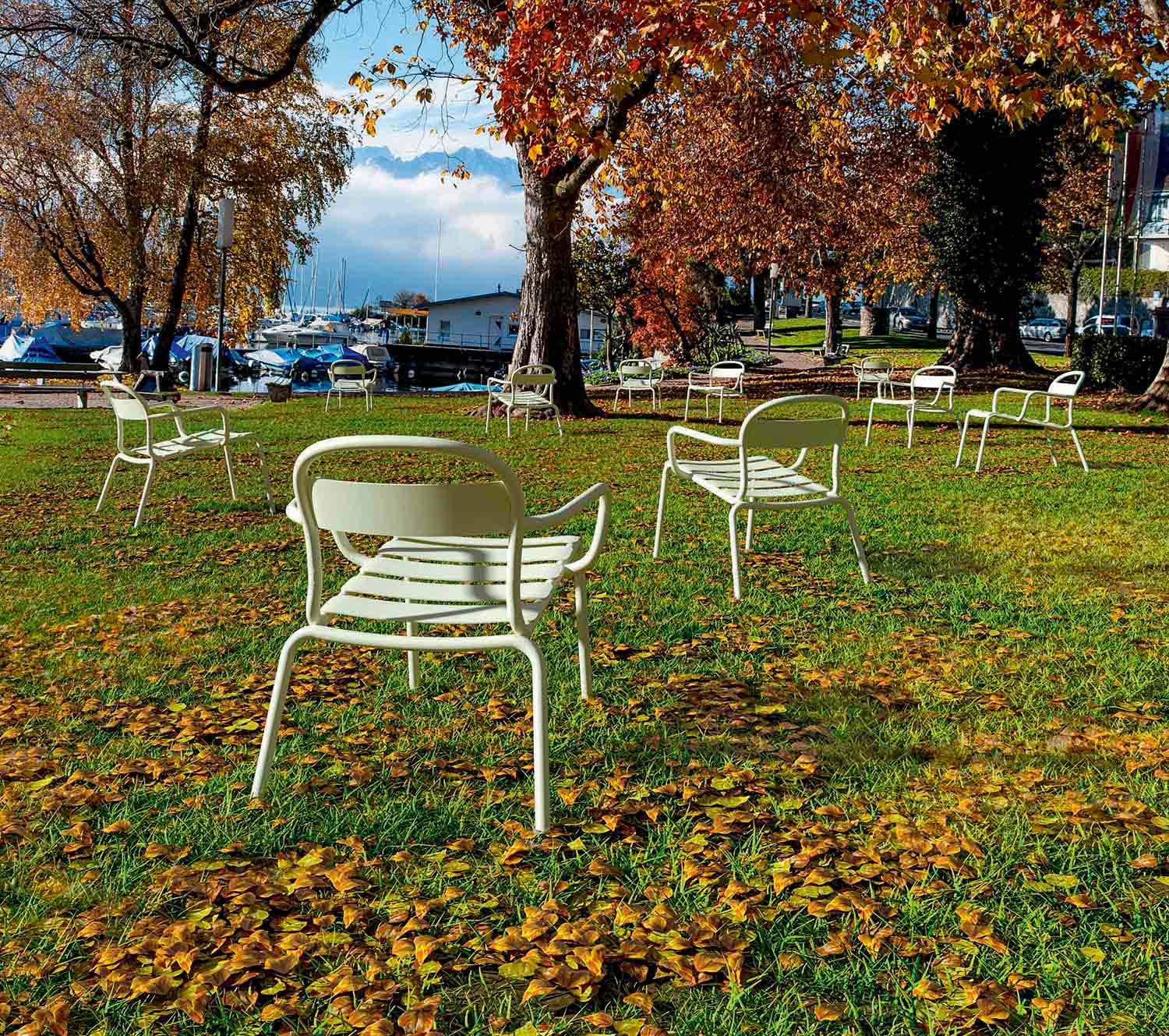Designen av denna schäslong gör det lätt att tänka sig i en trädgård eller terrass, men utesluter inte att det används även i inomhus situationer i hemmamiljöer och icke-inhemska miljöer. Helt i lackerad aluminium, tack vare de 8 tillgängliga färger, anpassar den perfekt till någon inredning situation, från den mest moderna till den mest traditionella, bidrar till att ge färg och personlighet till rummet.