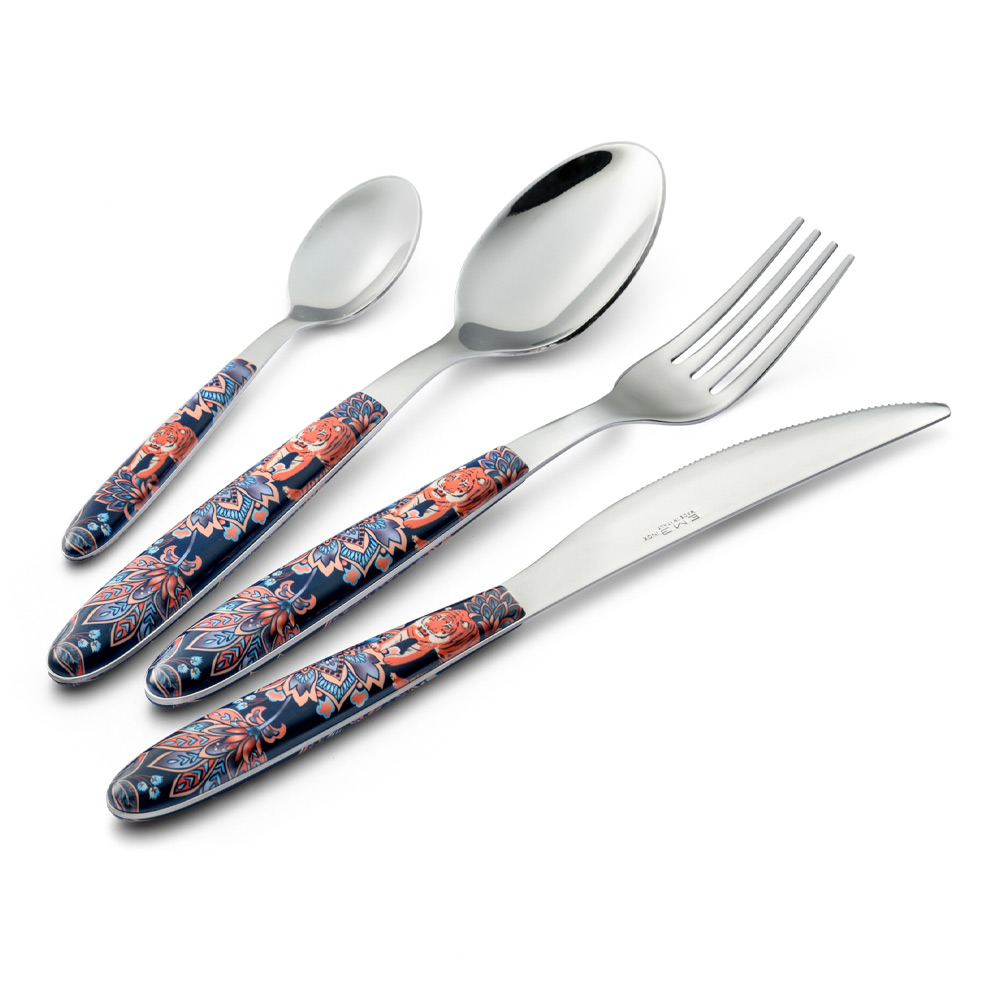 Bestickset i rostfritt stål och färgat plasthandtag med tiger, 24 delar tillverkade i Italien.