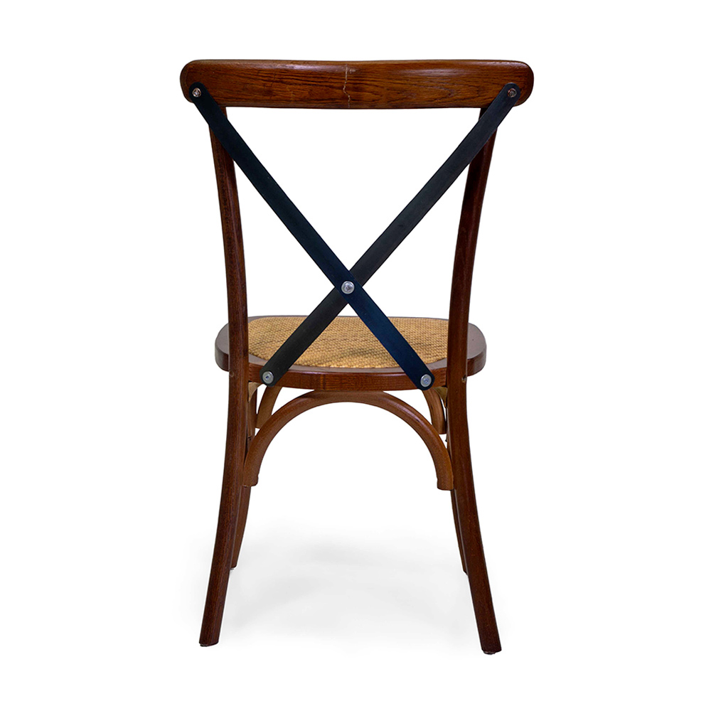 Den här trästolen kombinerar charmen hos klassisk design med detaljer som förstärker dess tidlösa elegans. Den robusta ramen i trä garanterar soliditet och hållbarhet, medan det X--formade ryggstödet i järn ger en touch av industriell stil som passar perfekt med den traditionella estetiken.