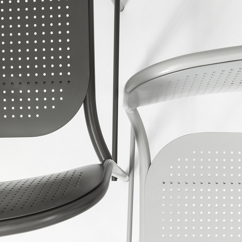livlig och rolig estetik men också för dem som älskar en mer sober och elegant stil. Möjligheten att stapla understryker också dess funktionella sida och gör den till en perfekt lösning även för kontraktsmiljöer som barer och restauranger där det är väsentligt att kunna optimera utrymmen när fåtöljena inte används.