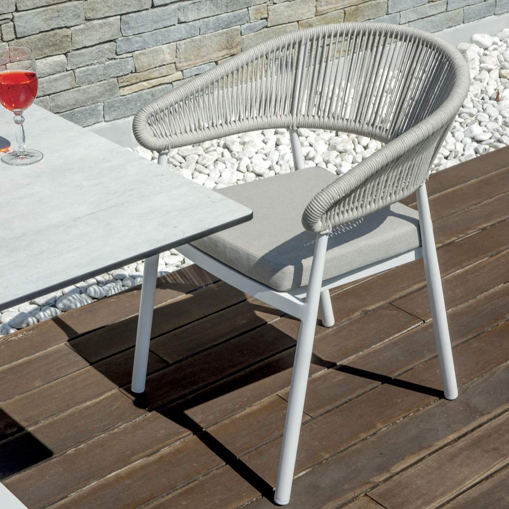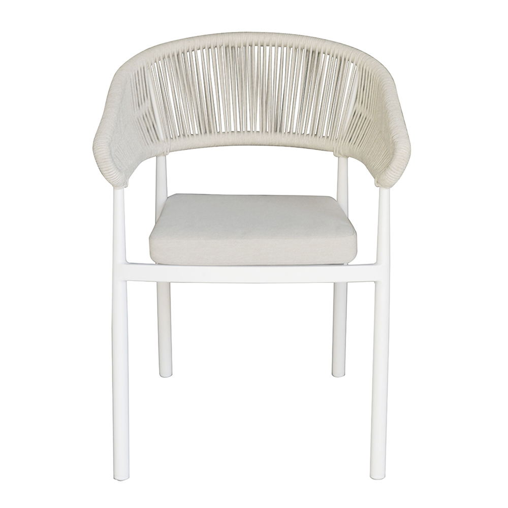 Giv en touch av sofistikerad stil och funktionalitet till dina utomhusmiljöer med denna moderna designstol. Den repförsedda ryggstödet tillför ett element av handgjord elegans, medan den aluminiumförsedda sitsen ger styrka och komfort, vilket gör den idealisk för daglig användning.