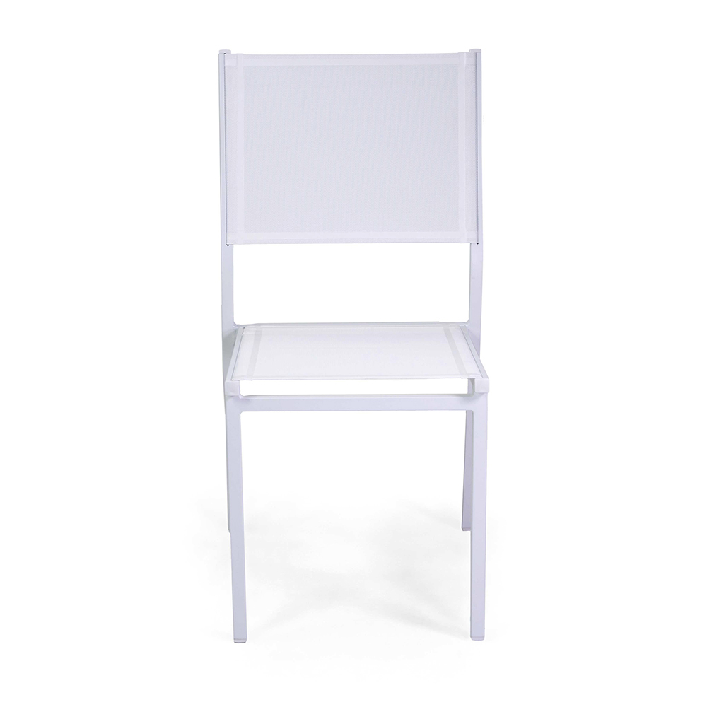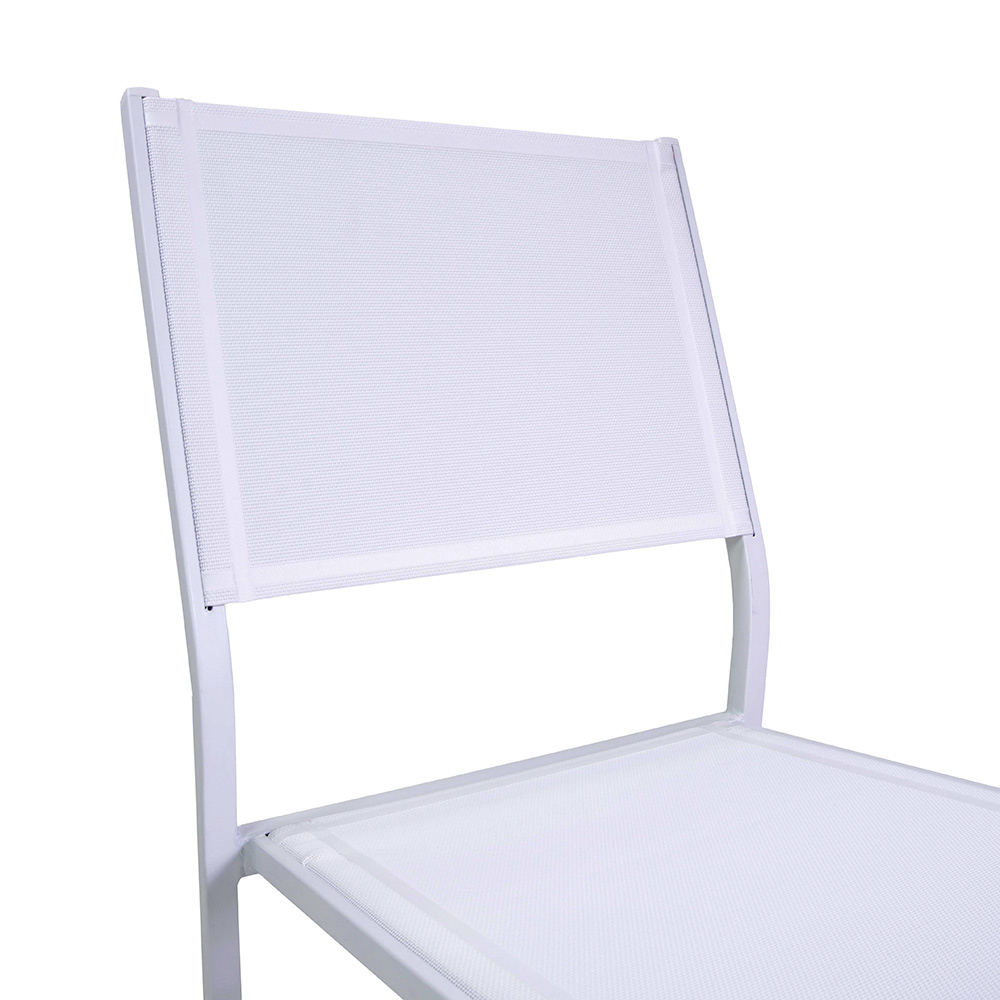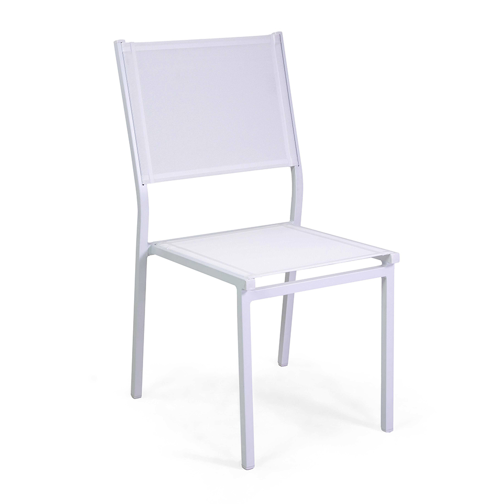 Den här stolen med en vit pulverlackerad aluminiumram representerar den perfekta balansen mellan funktionalitet och stil, perfekt för utomhusmiljöer som trädgårdar och terrasser. Den vita textilenen ger den inte bara ett modernt och elegant utseende, utan säkerställer också en bekväm och väderbeständig sits.