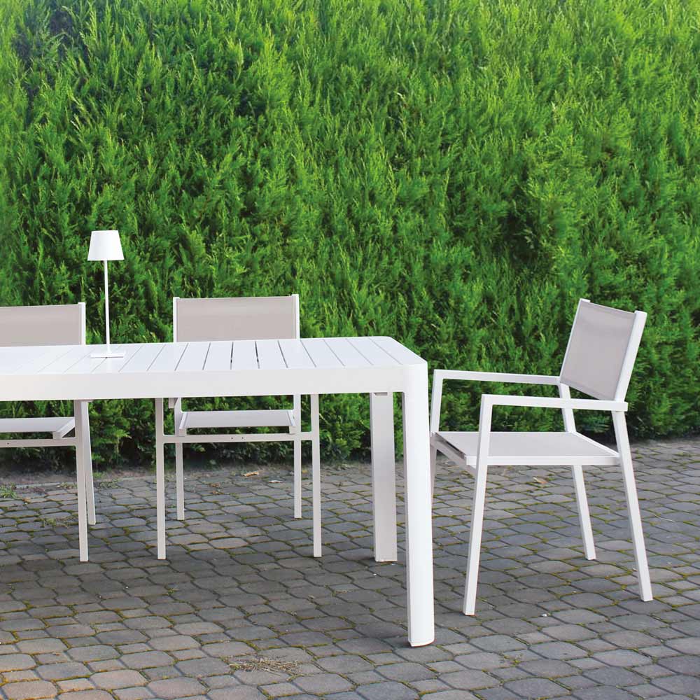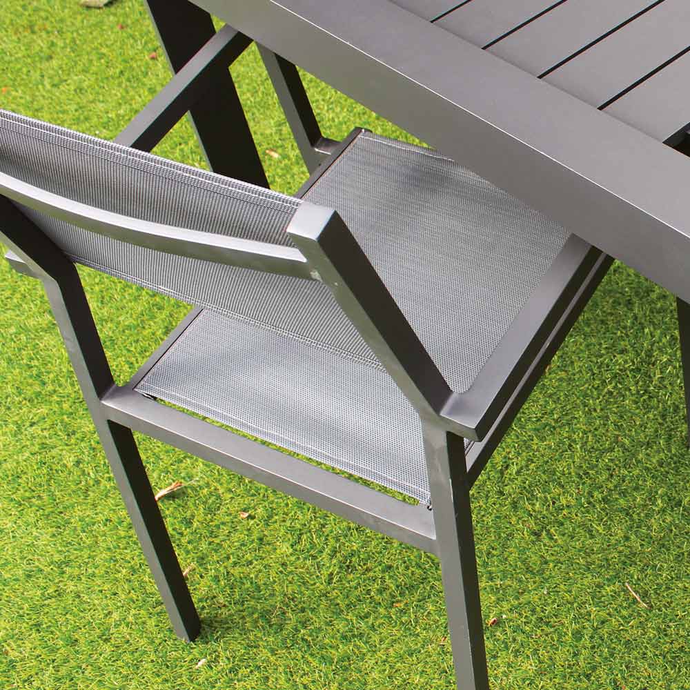 Sits och ryggstöd i textilene , ett andningsbart och bekvämt tekniskt material, garanterar en ergonomisk och behaglig sittupplevelse även under de varmaste dagarna. Färgen ger stolen en sober elegans , perfekt för att åtfölja mat- eller soffbord i trädgårdar, terrasser eller kontraktsutrymmen.