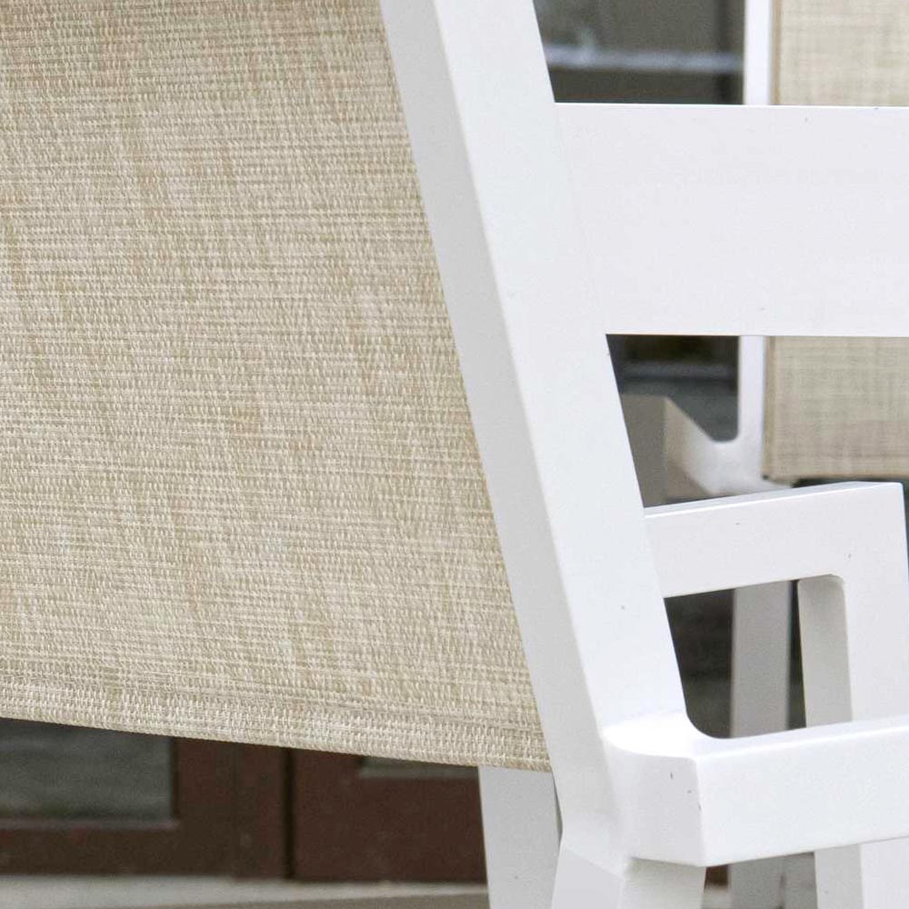 Den robusta strukturen i matt vit aluminium garanterar hållbarhet och motståndskraft mot elementen och bibehåller sin skönhet över tiden. Klädseln i beige textilene tillför inte bara en touch av klass med sin raffinerade textur, utan erbjuder också oslagbar komfort tack vare sin elasticitet och andningsförmåga.
