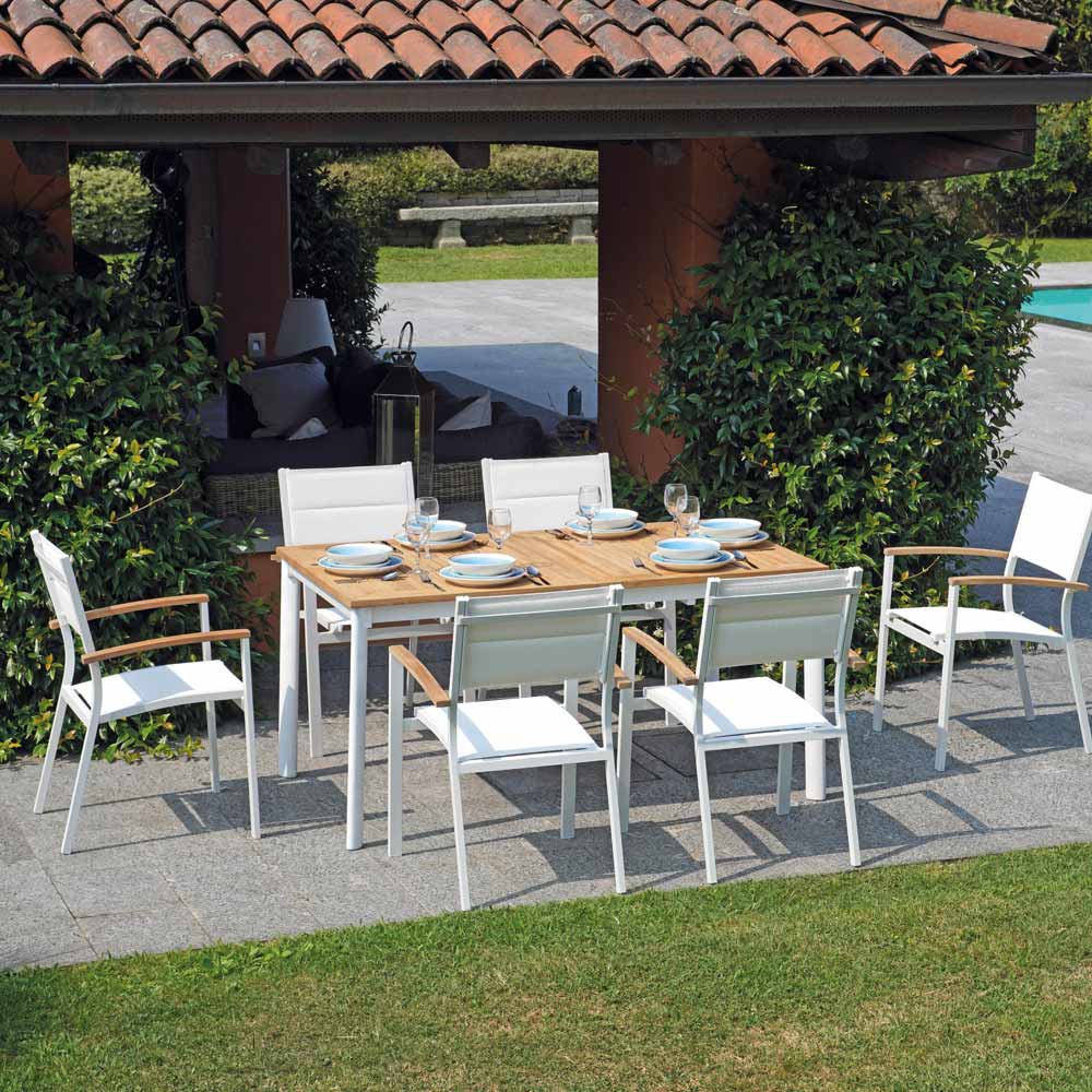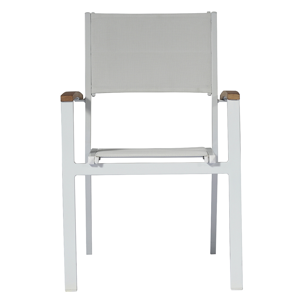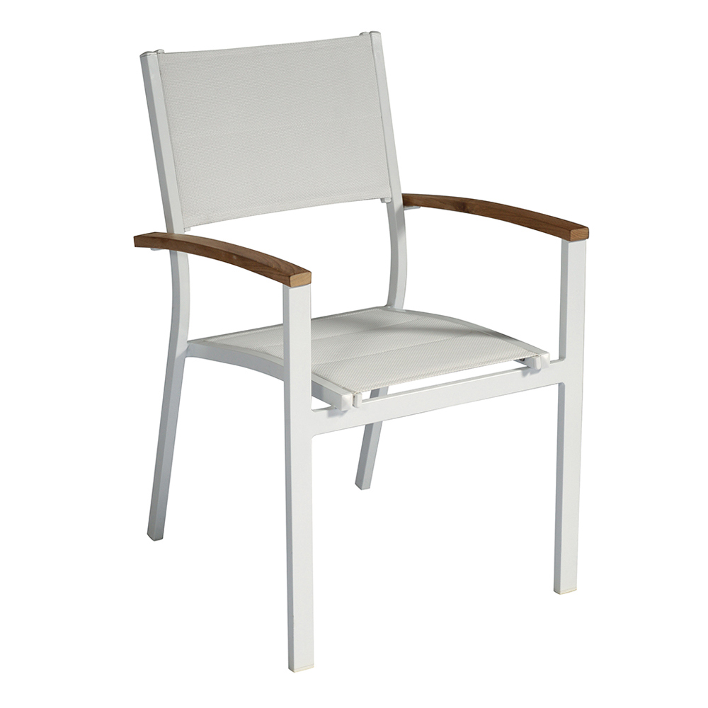 Stapelbar utomhusstol med struktur gjord av aluminium och sits i elfenben vadderad textilen berikad med eleganta teakarmstöd . Denna utomhusstol kombinerar design och enkelhet , resultatet av enkla men motståndskraftiga material som ger liv åt en produkt med en originell och avantgardistisk design, perfekt för att komplettera alla miljöer.