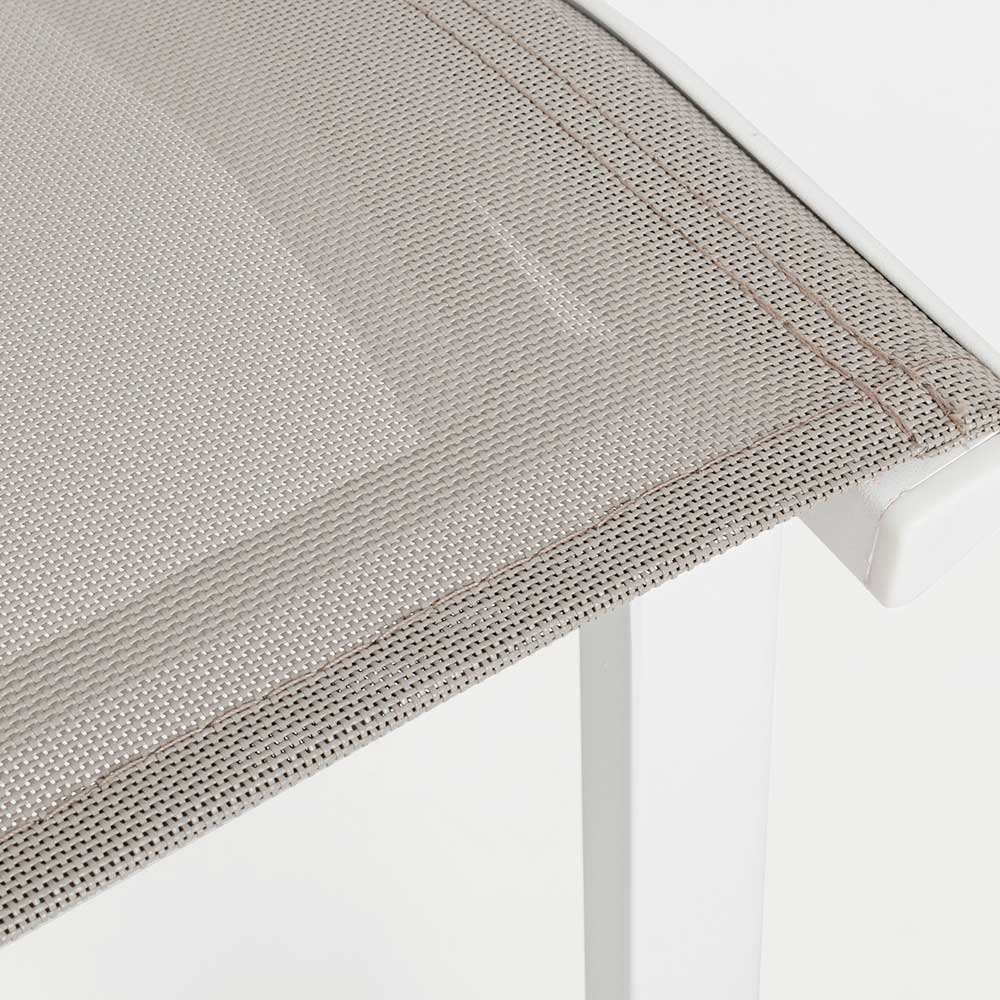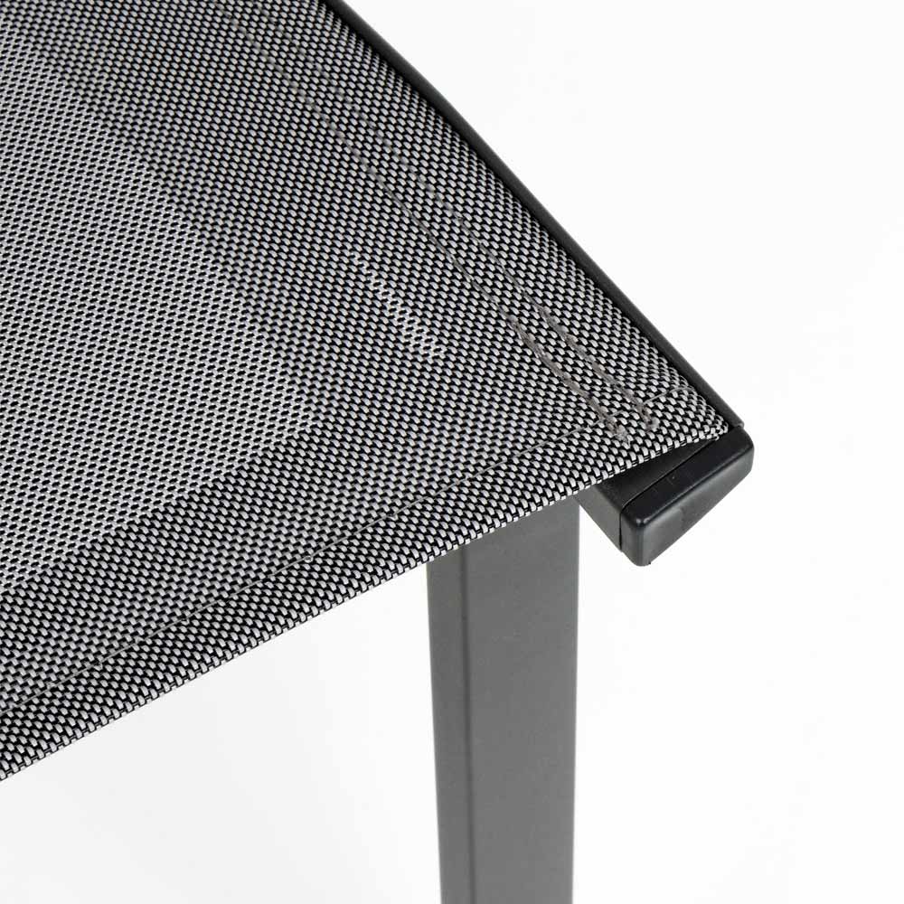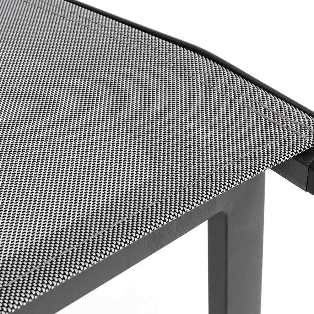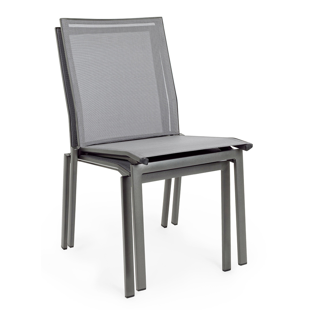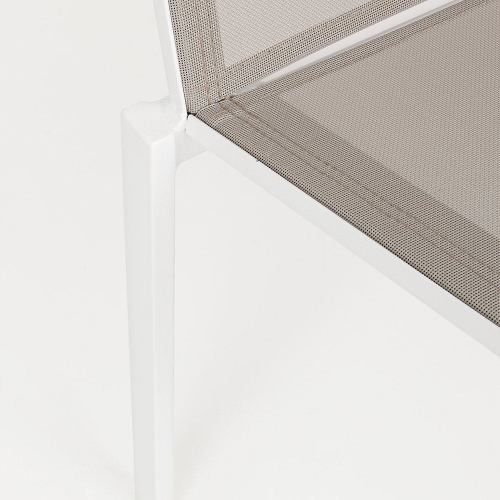 aluminiumstruktur (polyester). Sits och rygg klädda i 1x1 Phifer textilene. Stapelbar.