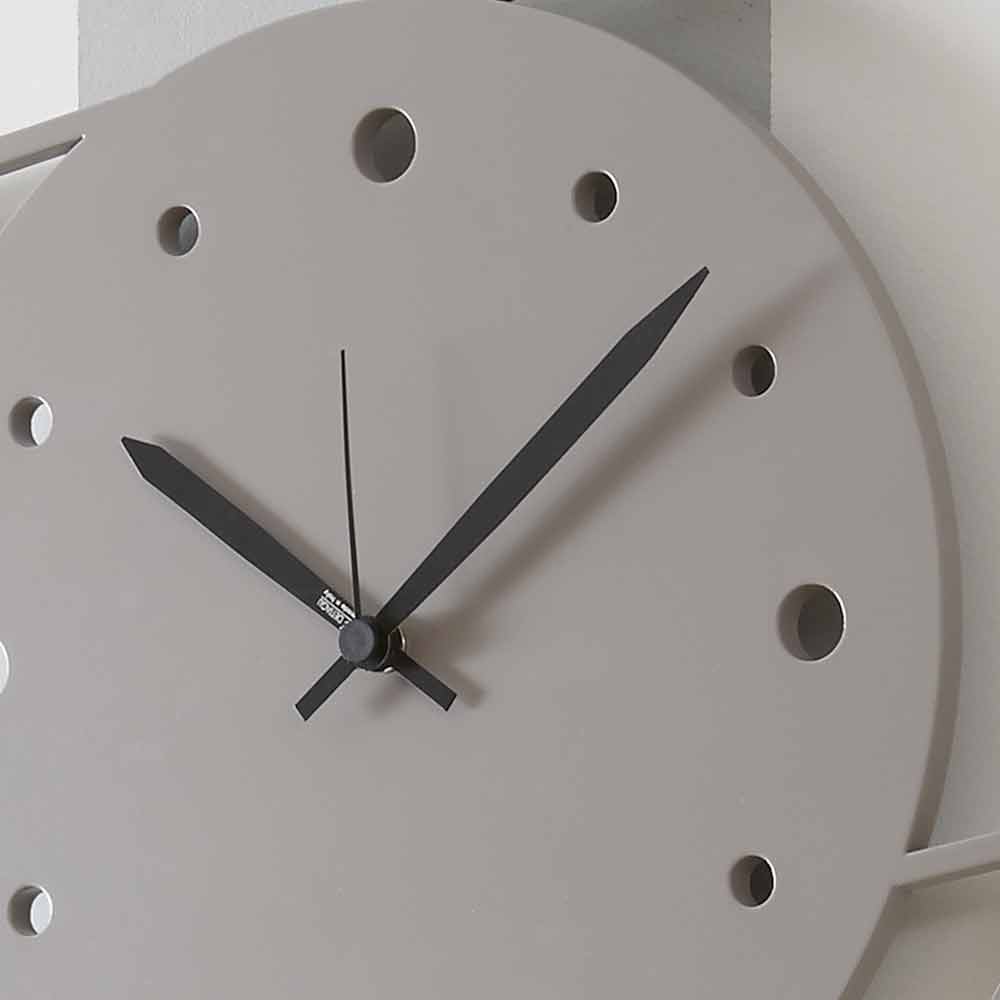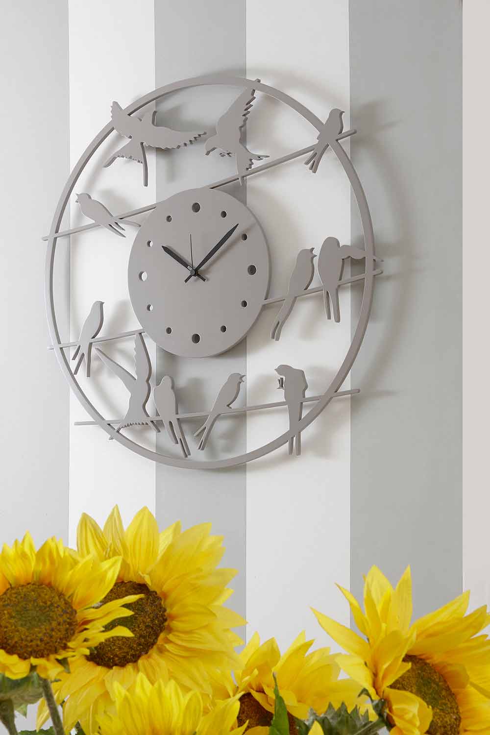 Stor och original väggklocka, rund och modern design med fåglar, i vitt, taupe eller grått trä tillverkat i Italien.