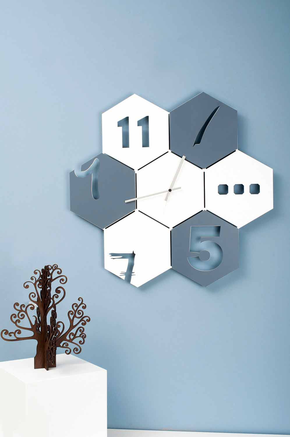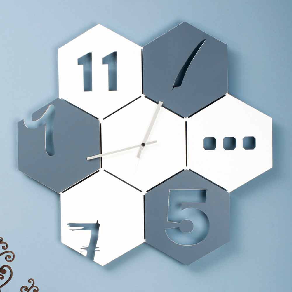 Stor väggklocka, design bestående av sexhörningar i vitt och färgat trä tillverkat i Italien.