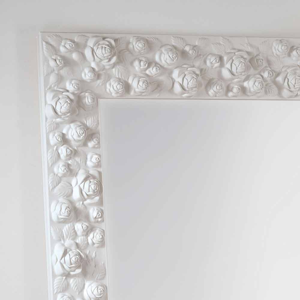 Spegeln Flower kännetecknas av en hantverks genomföras med användning av material av hög kvalitet och med användning av erfarenhet av skickliga italienska hantverkare. Ramen är gjord av trä och är dekorerad med rosor. Vit sidenmatt. Spegelglas, 4mm tjock. Made in Italy. Från hang både vertikalt och horisontellt.