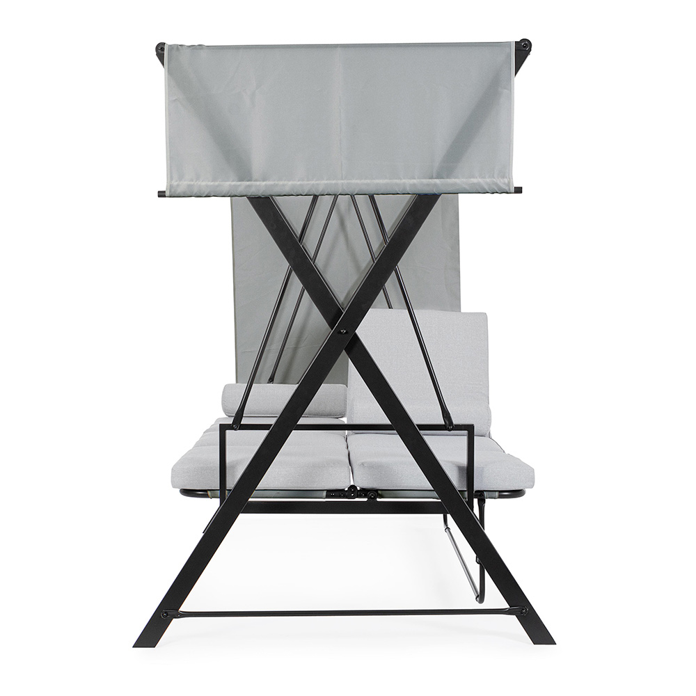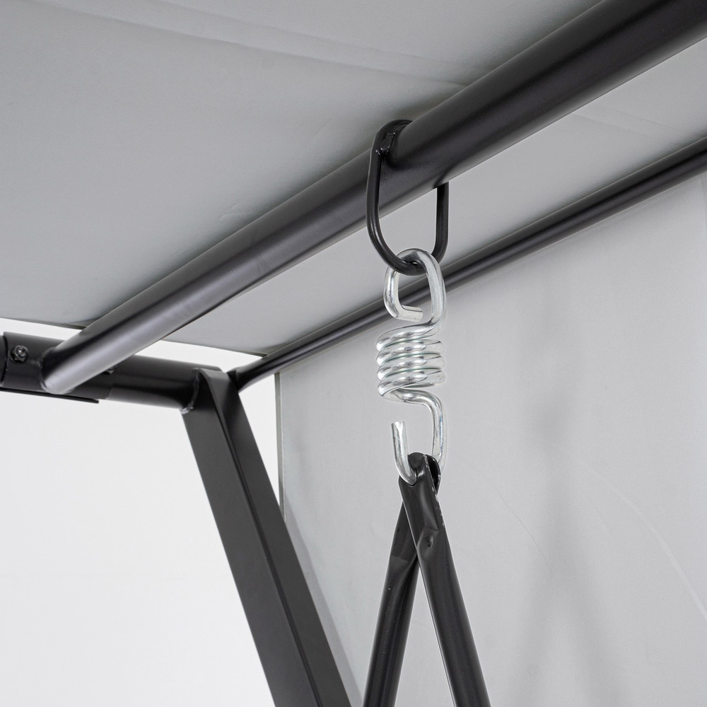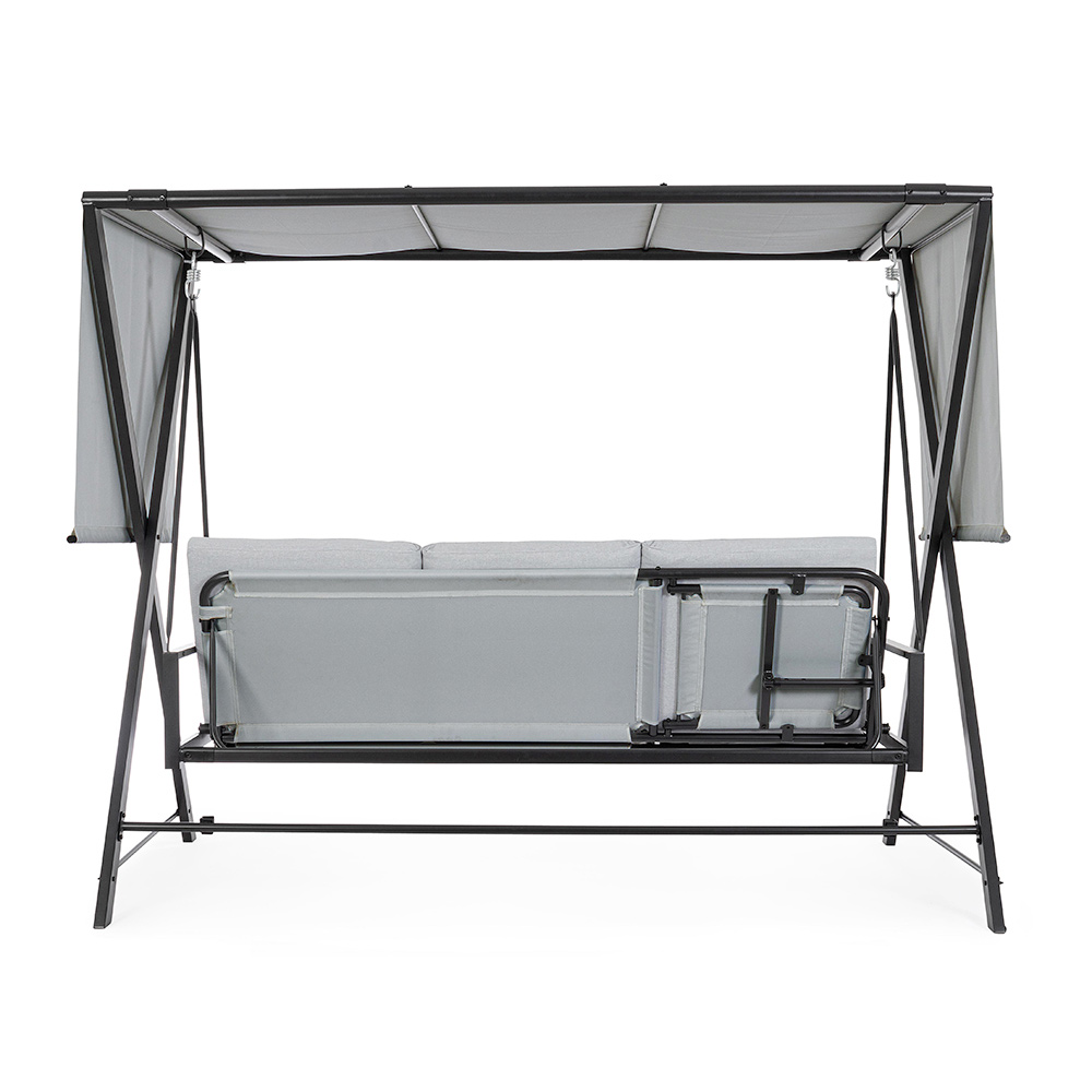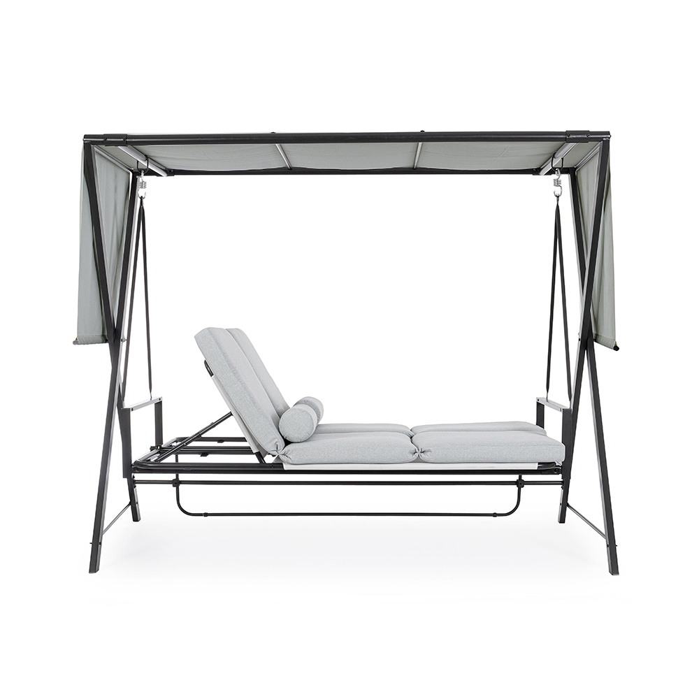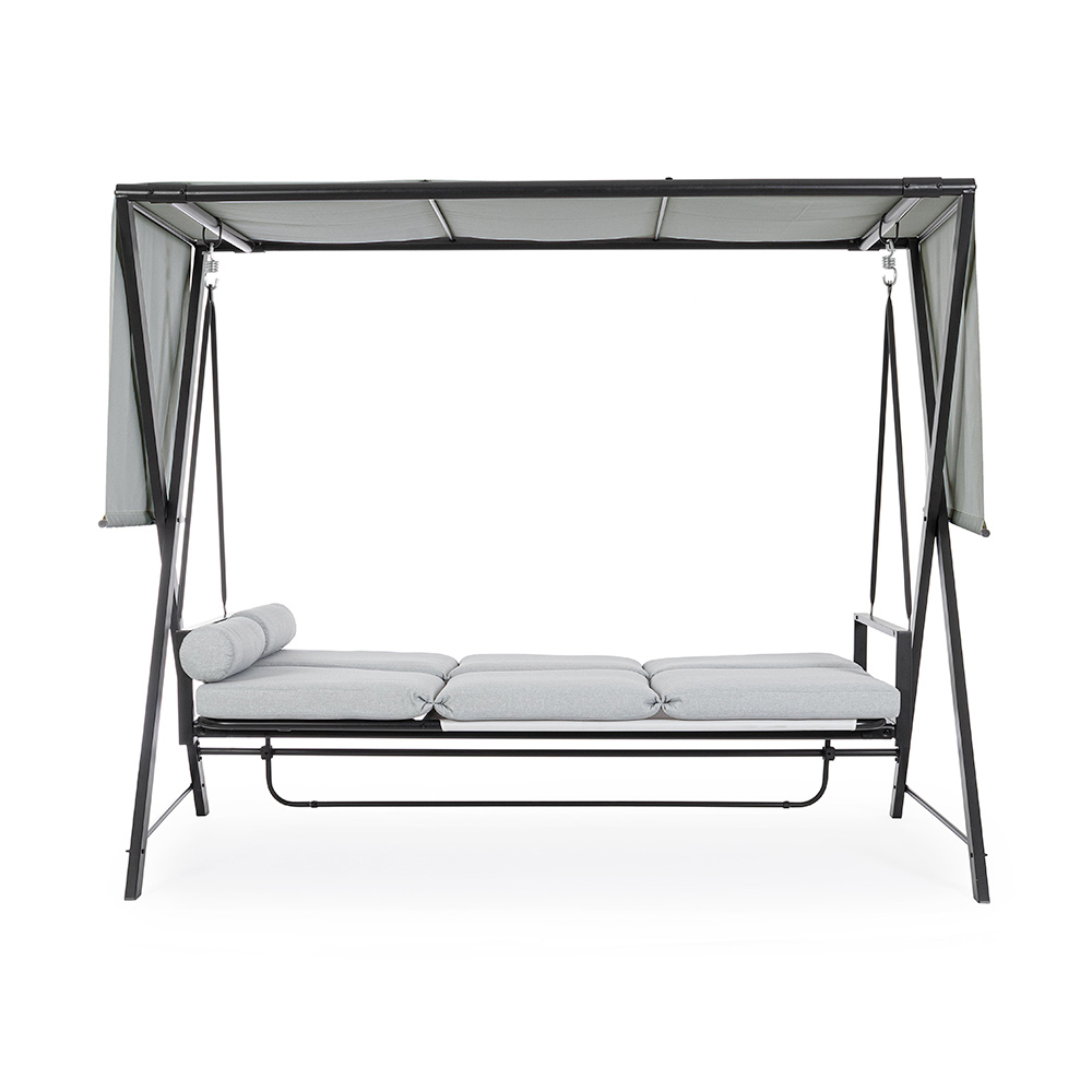 Det justerbara solskyddet ger skydd mot solens strålar, så att du kan justera skuggan efter eget tycke, medan sidogardinerna ger en touch av avskildhet och extra skydd . Denna gunga är mer än bara ett säte; det är en personlig tillflyktsort i din trädgård , en inbjudan att ta en paus från vardagens frenesi och återupptäcka nöjet av att spendera utomhus. Perfekt för dem som letar efter ett hörn av lugn och stil , den här gungan är idealisk för att höja avkopplingsupplevelsen i ditt utomhusutrymme.