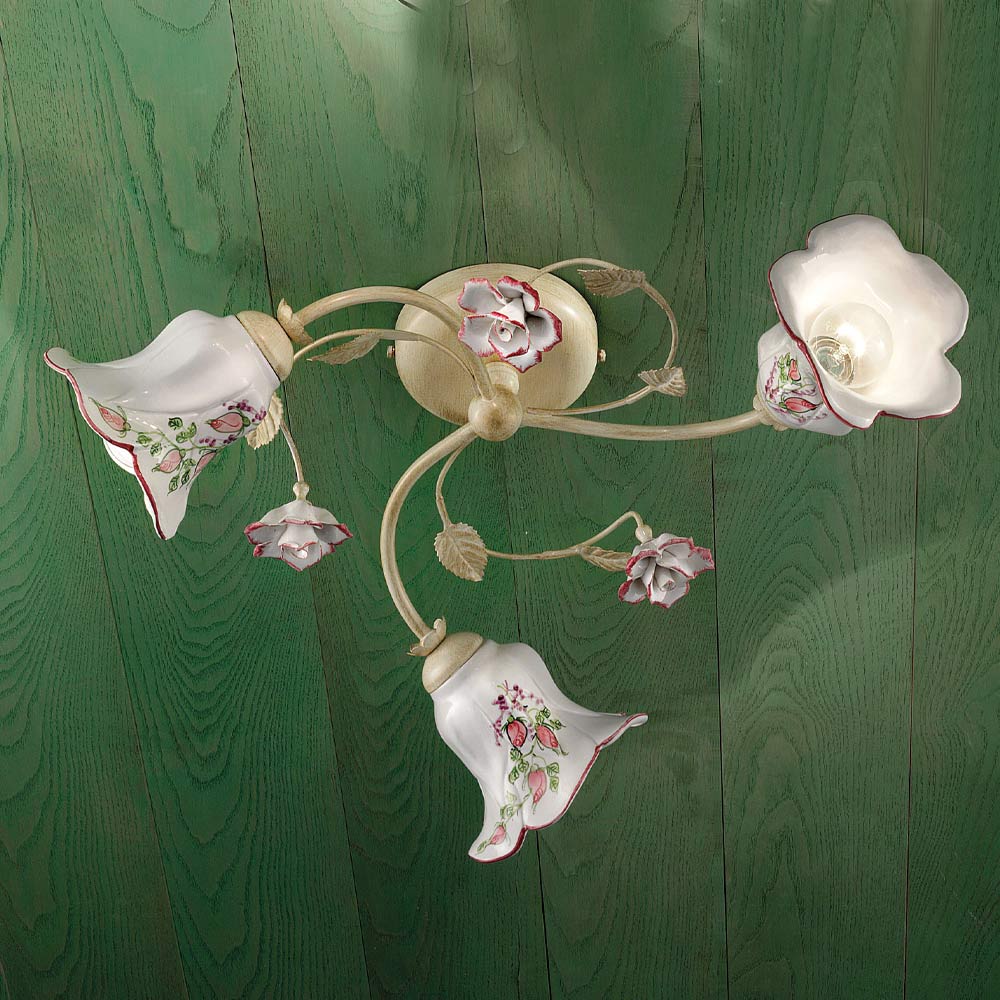 3 ljus taklampa i metall och keramik med handmålade rosor tillverkad i Italien av Ferroluce.