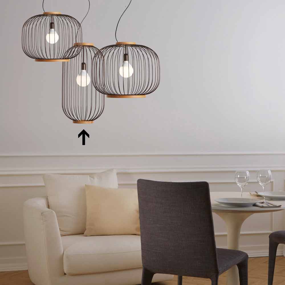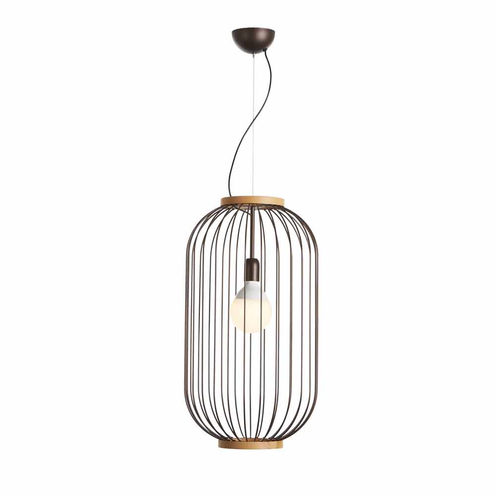 Suspension lampa tillverkad av formade stålstång och målade med epoxi pulver. De två banden som stänger kroppen rundade trä.